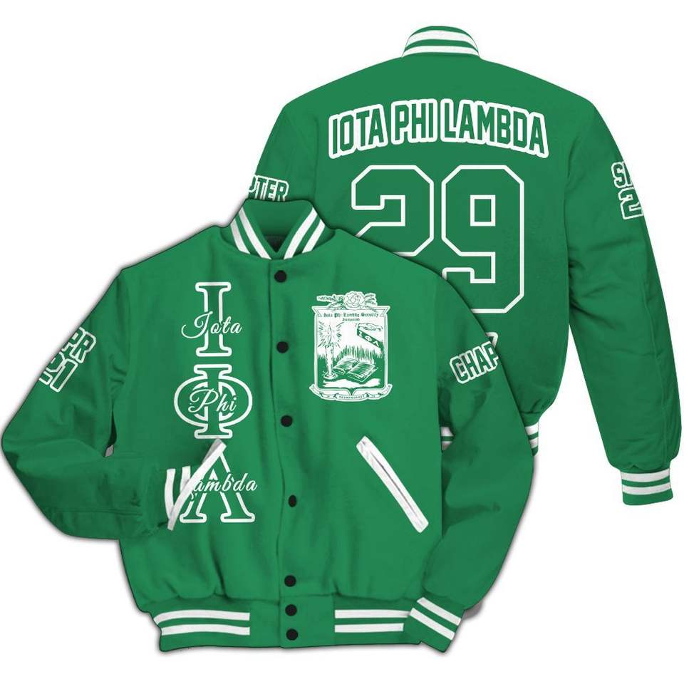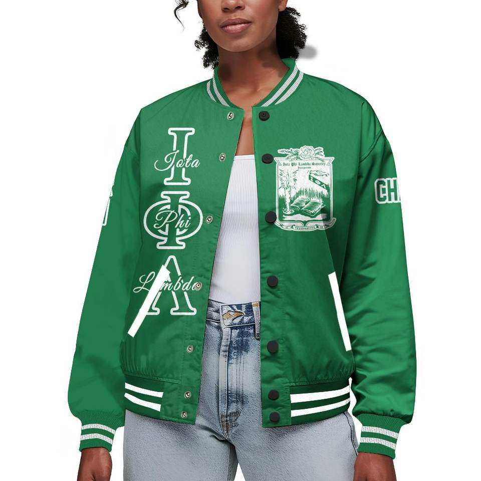 เสื้อแจ็คเก็ตวาร์ซิตี้แบบสั่งทำพิเศษสำหรับผู้หญิง Iota Phi Lambda สีเขียวมรกตเข้ม พร้อมตราสัญลักษณ์ตัวอักษร หมายเลข และปี แบบเสื้อแจ็คเก็ตบอมเบอร์สำหรับชมรมนักศึกษาหญิง