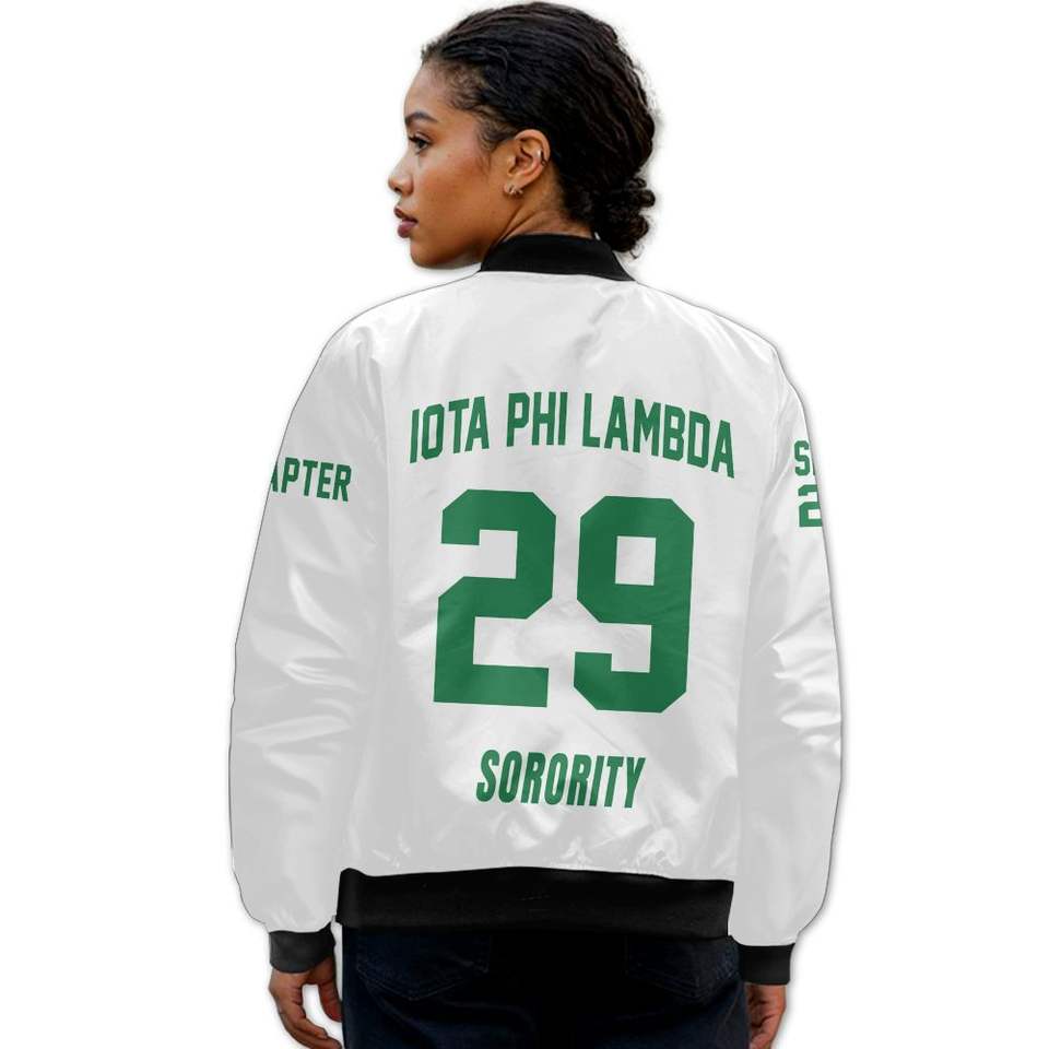 เสื้อแจ็คเก็ตบอมเบอร์แบบสั่งทำพิเศษสำหรับผู้หญิง Iota Phi Lambda สีขาว พร้อมตราสัญลักษณ์ตัวอักษรกรีกด้านหน้าและด้านหลัง หมายเลขปี และซิป