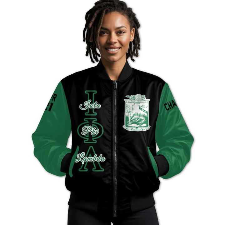 เสื้อแจ็คเก็ตวาร์ซิตี้แบบสั่งทำพิเศษสำหรับผู้หญิง Iota Phi Lambda สีดำผสมสีเขียวมรกต พร้อมตราสัญลักษณ์ตัวอักษรกรีกด้านหลัง ปีที่ติดอยู่ที่ซิปด้านหลัง แบบแจ็คเก็ตบอมเบอร์