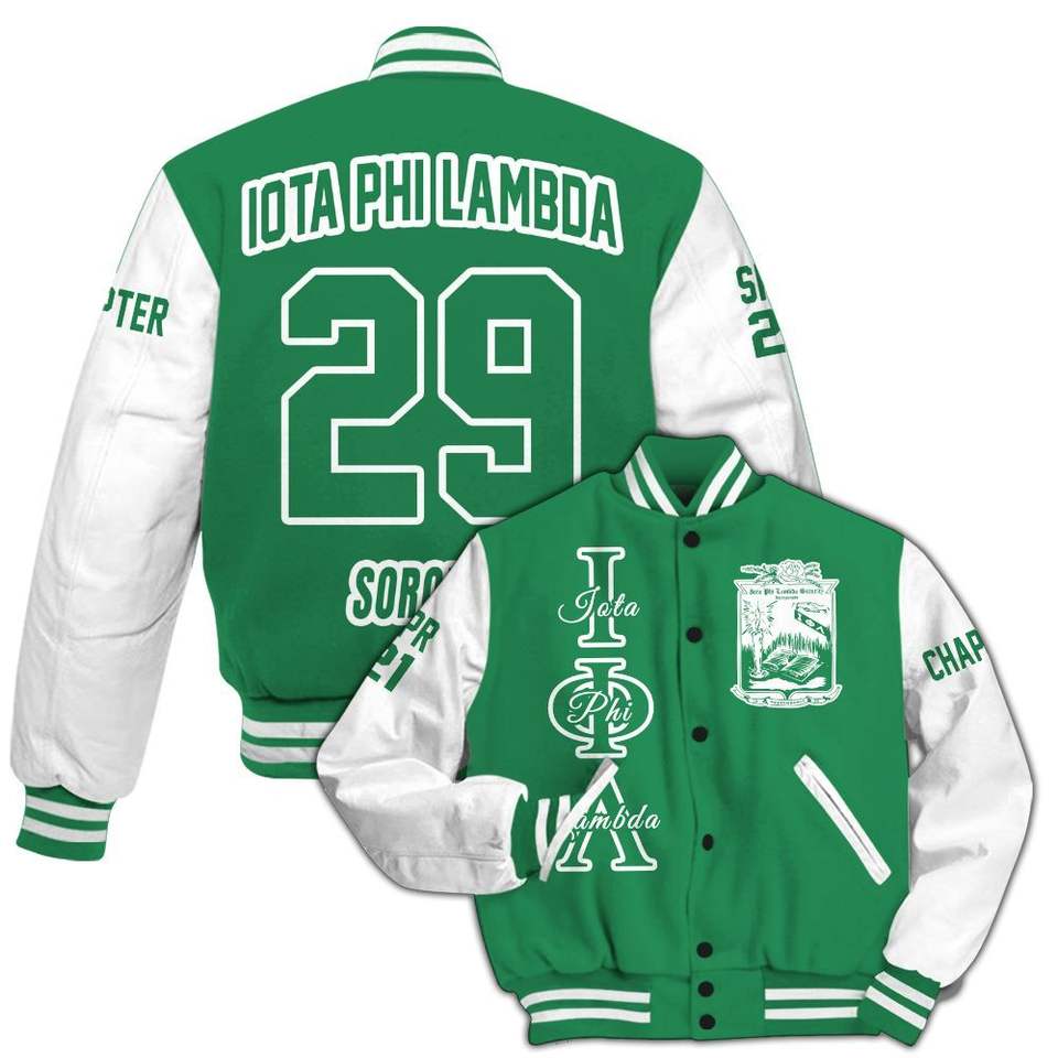 เสื้อแจ็คเก็ตวาร์ซิตี้แบบสั่งทำพิเศษสำหรับผู้หญิง Iota Phi Lambda สีเขียวมรกต ตัวอักษรสีขาว พร้อมตราสัญลักษณ์ หมายเลข และปี แบบเสื้อแจ็คเก็ตบอมเบอร์สำหรับชมรมนักศึกษาหญิง