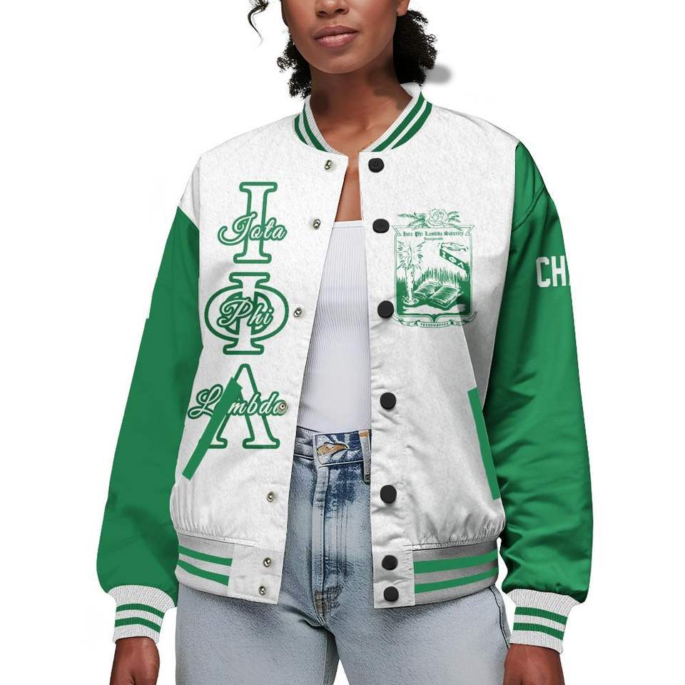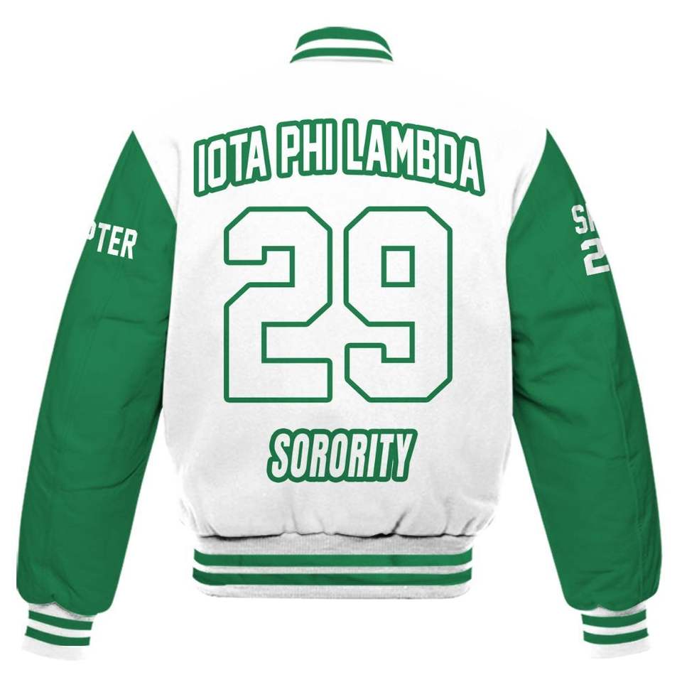 Iota Phi Lambda Women Custom Chapter Varsity Jacket White Emerald Green Letter Crest Number Year Sorority Bomber Jacket