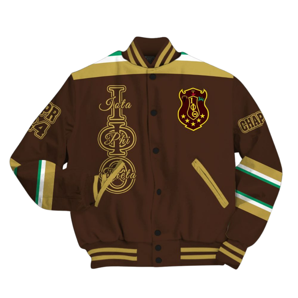 Iota phi theta 1963มหาวิทยาลัยเลตเทอร์แมนสีน้ำตาลทองเสื้อผ้าชีวิตชาวกรีกมรดกของพี่น้องเย็บปักด้านหน้า