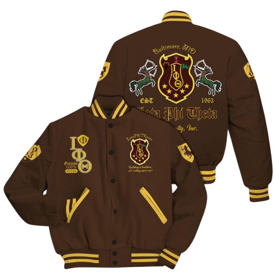 Iota phi theta 1963แจ็คเก็ตทีมตัวแทนมหาวิทยาลัยคลาสสิกสไตล์ตัวอักษรสีน้ำตาลทองเสื้อผ้าชีวิตชาวกรีกแจ๊กเก็ตวิทยาลัยพี่น้อง