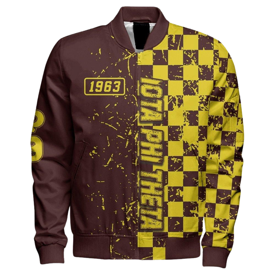 เสื้อแจ็คเก็ตทรงบอมเบอร์ผ้าซาตินแบบกรีก ยี่ห้อ Iota Phi Theta ปี 1963 คอตั้ง ปักโลโก้สมาคมนักศึกษาด้านหน้า เสื้อคลุมกันหนาวคุณภาพพรีเมียม
