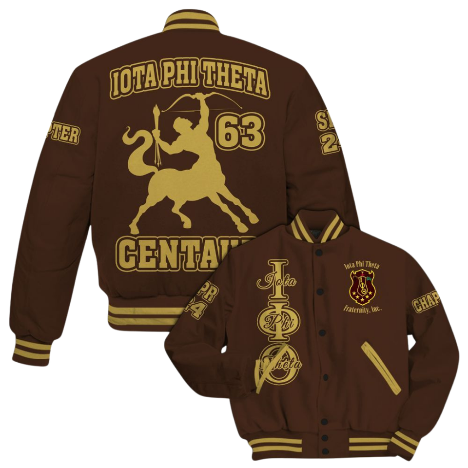 Iota phi theta 1963แจ็คเก็ตสไตล์เลตเทอร์แมนเสื้อโค้ทตัวนอกสีทองสีน้ำตาลเข้มแบบพรีเมียม