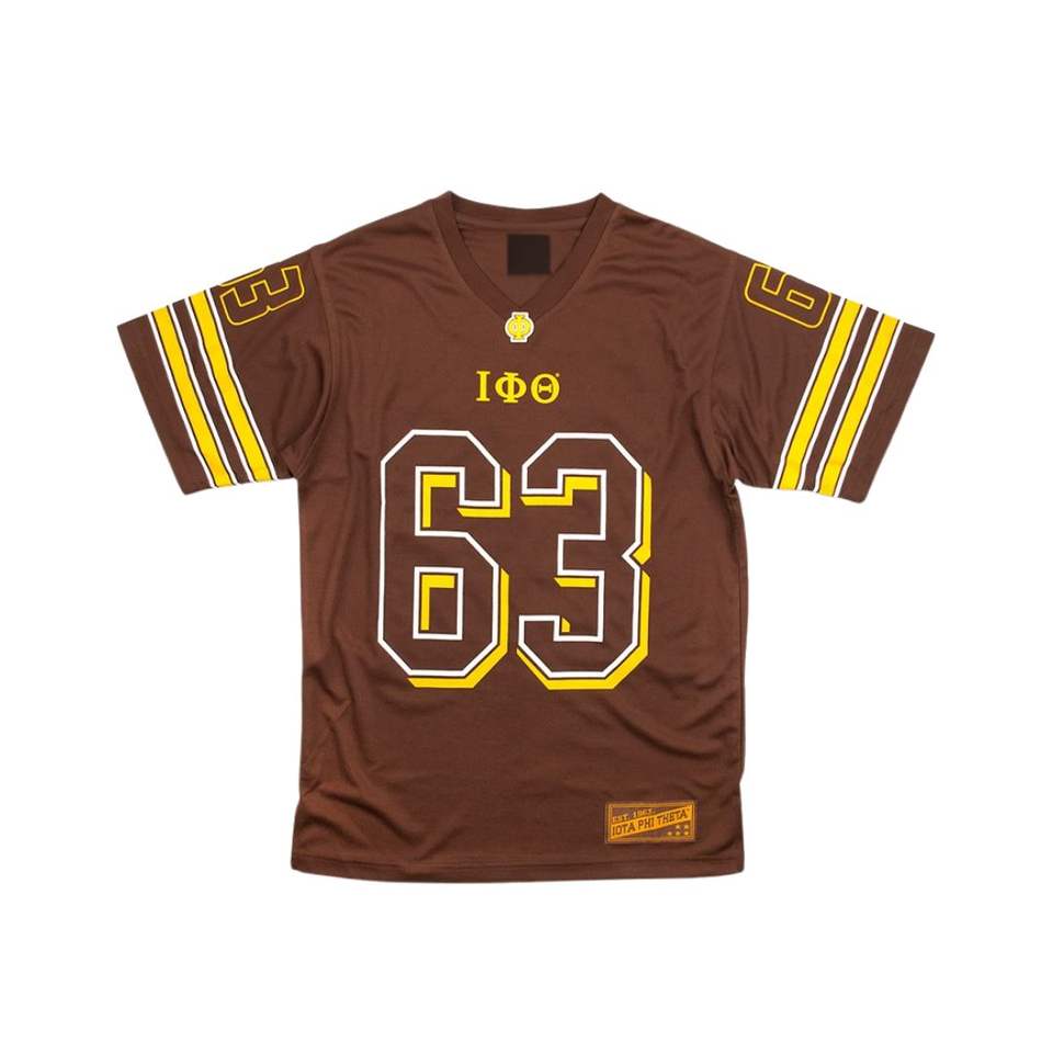 เสื้อยืดฟุตบอล iota phi theta 63เสื้อกีฬาลายพี่น้องสีทองและน้ำตาลสำหรับวันแข่งขัน