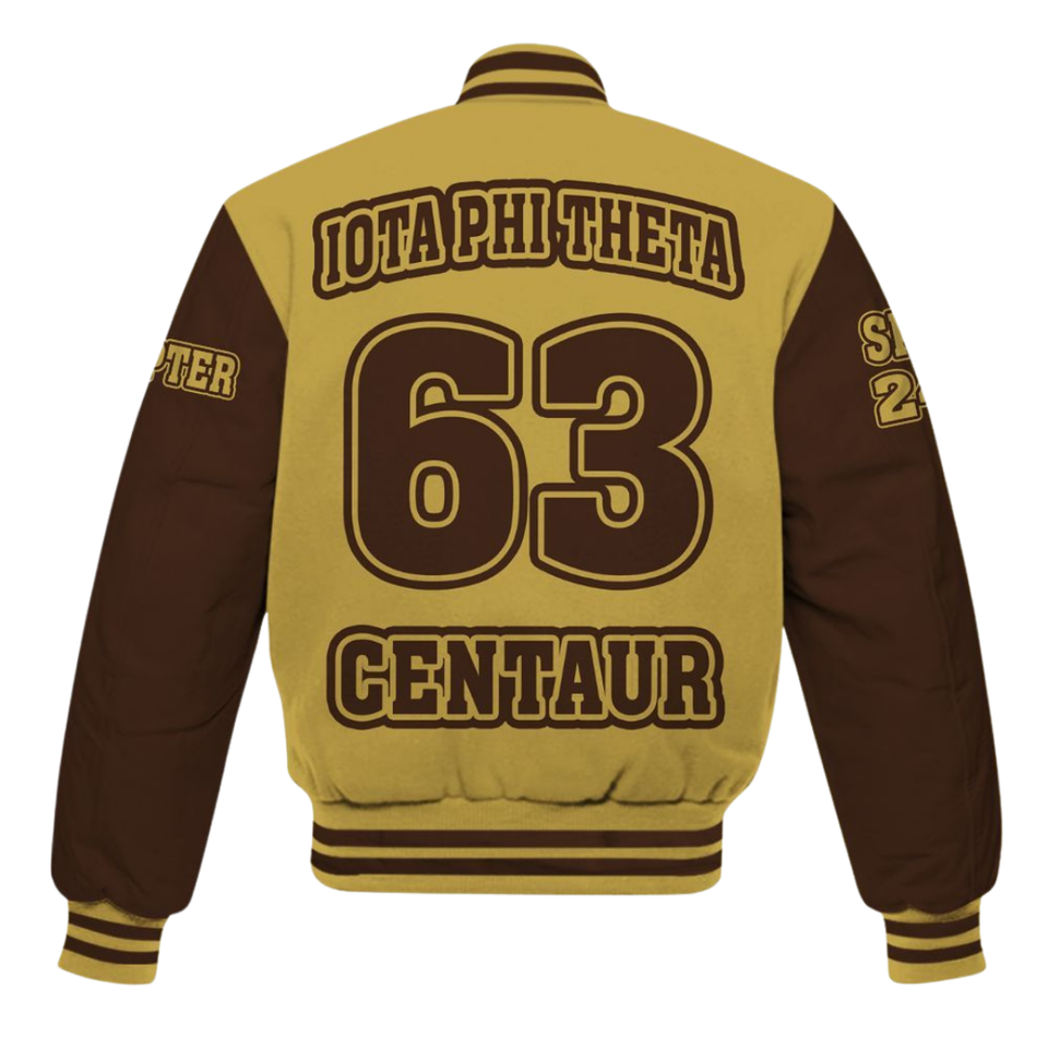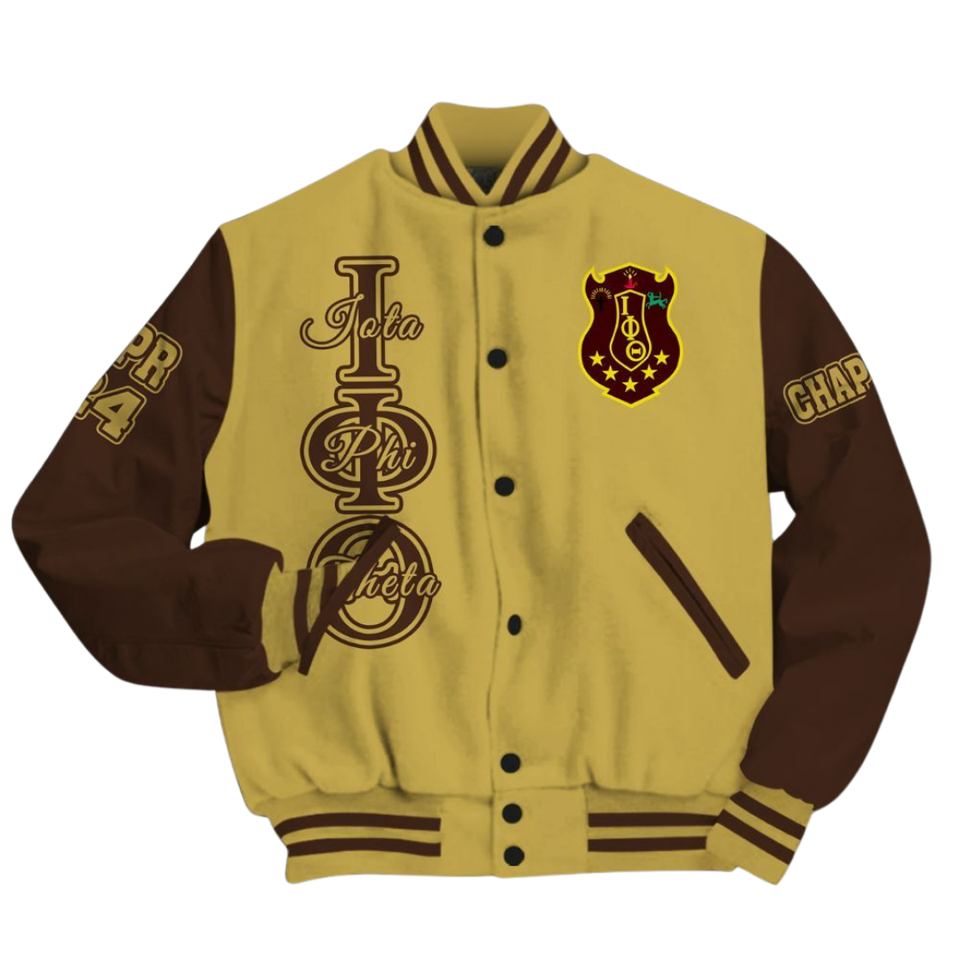 Iota phi เสื้อทีต้าสีน้ำตาลทองเสื้อ1963เลตเทอร์แมนตัวแทนมหาวิทยาลัยเสื้อชีวิตพี่น้องชาวกรีกเครื่องแต่งกายคลาสสิกของมหาวิทยาลัย