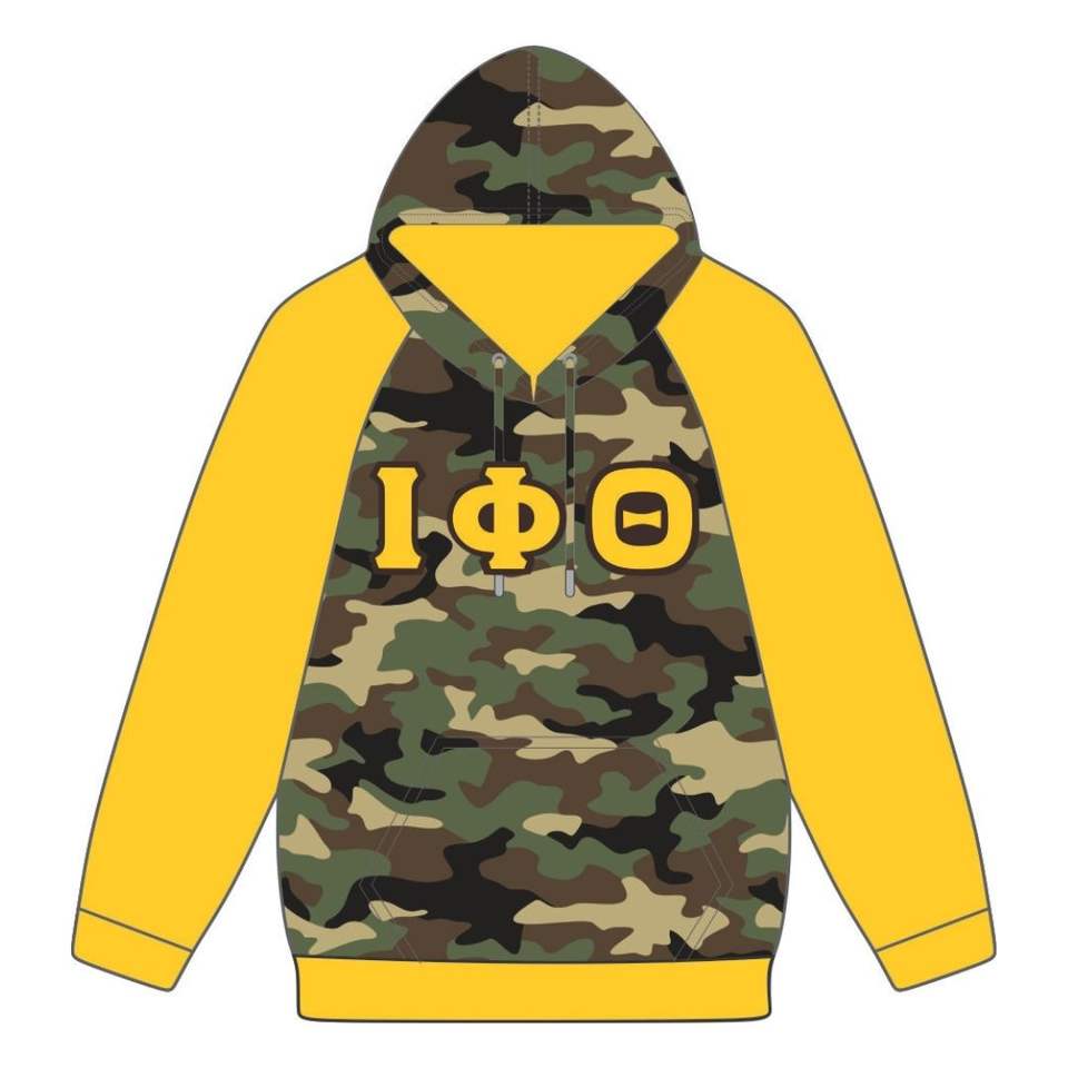 Iota phi theta Camo ร่างกายสีทองแขน Raglan เสื้อสวมหัวมีฮู้ดผ้าฝ้ายผสมเครื่องแต่งกายพี่น้องกรีกที่กำหนดเองศักดิ์สิทธิ์เก้า hbcu