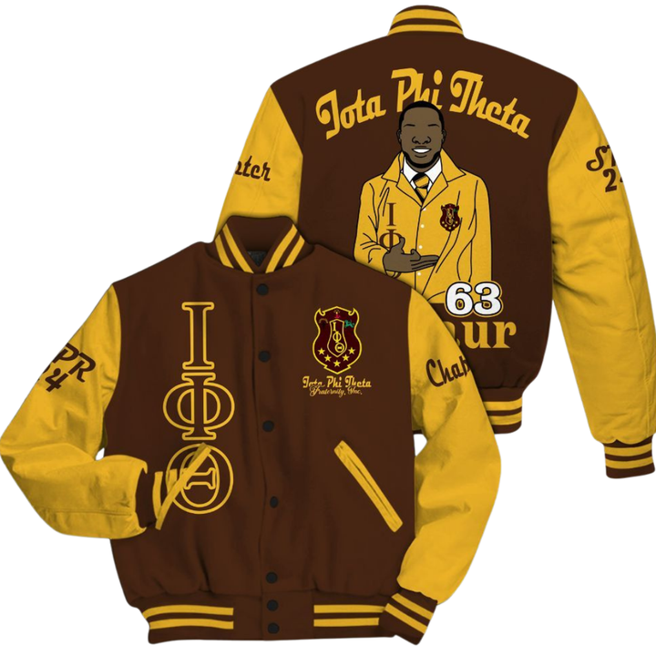 Iota phi แจ็คเก็ตนักเรียน1963สไตล์กรีก, แจ็คเก็ตเลตเทอร์แมนสีน้ำตาลทองเสื้อผ้าพี่น้องสไตล์นักศึกษาระดับพรีเมียม