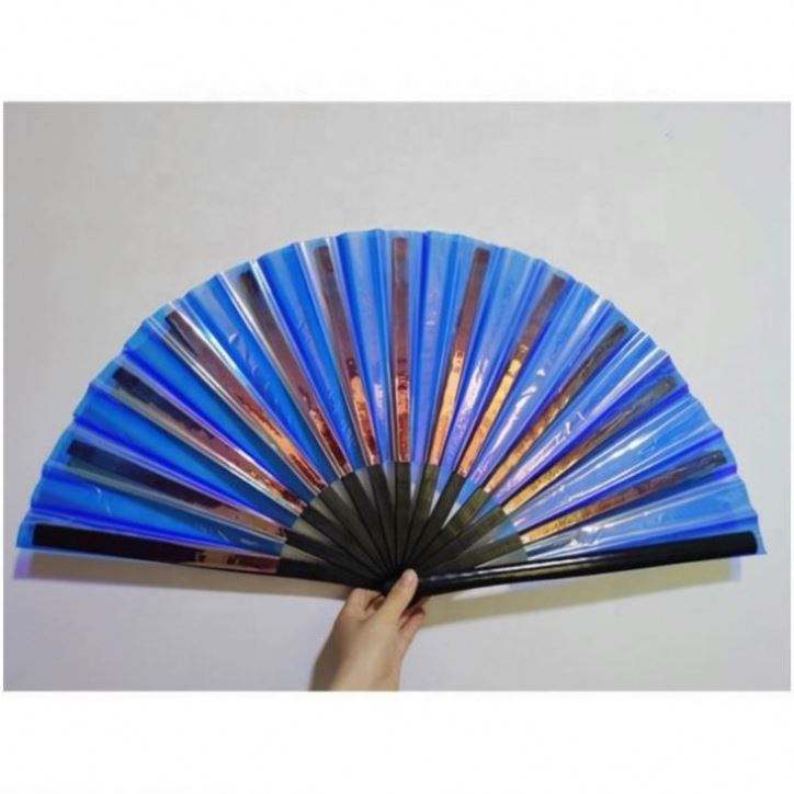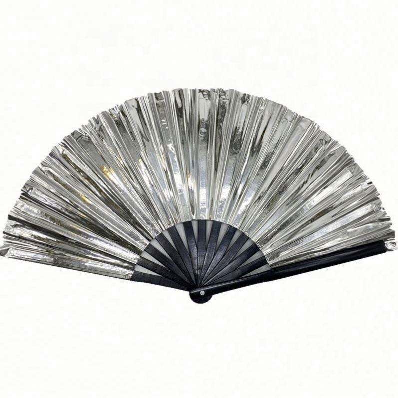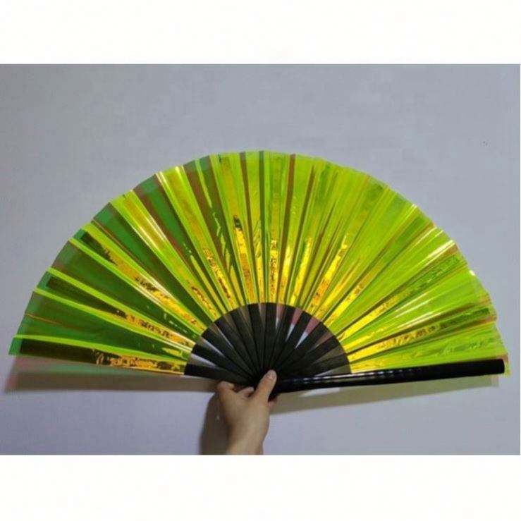 พัดมือพับได้ลายดอกไม้ ขนาด 33 ซม. ทำจากไม้ไผ่เคลือบ PVC สีรุ้งโฮโลแกรม เหมาะสำหรับงานเทศกาลดนตรีและปาร์ตี้