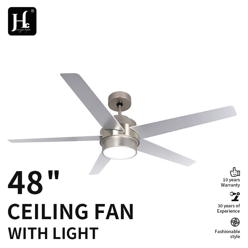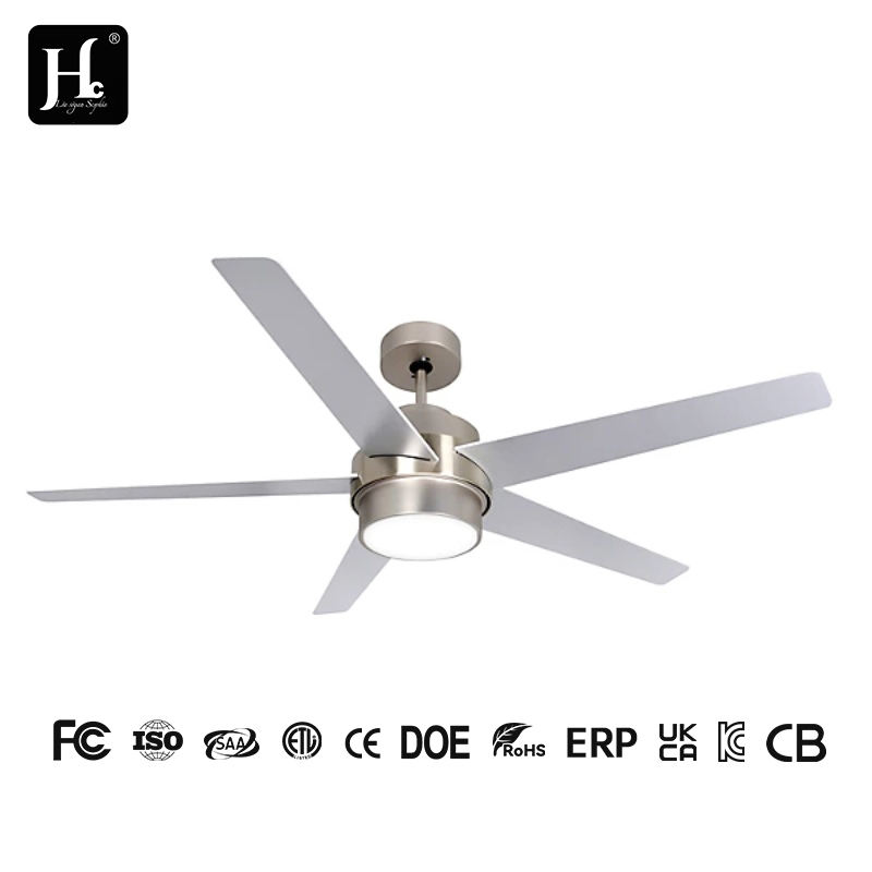 พัดลมเพดานดีซี 52 นิ้ว 5 ใบพัด ดีไซน์ทันสมัย โปรไฟล์ต่ำ 6 ระดับความเร็ว ปรับความสว่างได้ เงียบสงบ พร้อมไฟ LED ตกแต่ง ควบคุมด้วยรีโมท