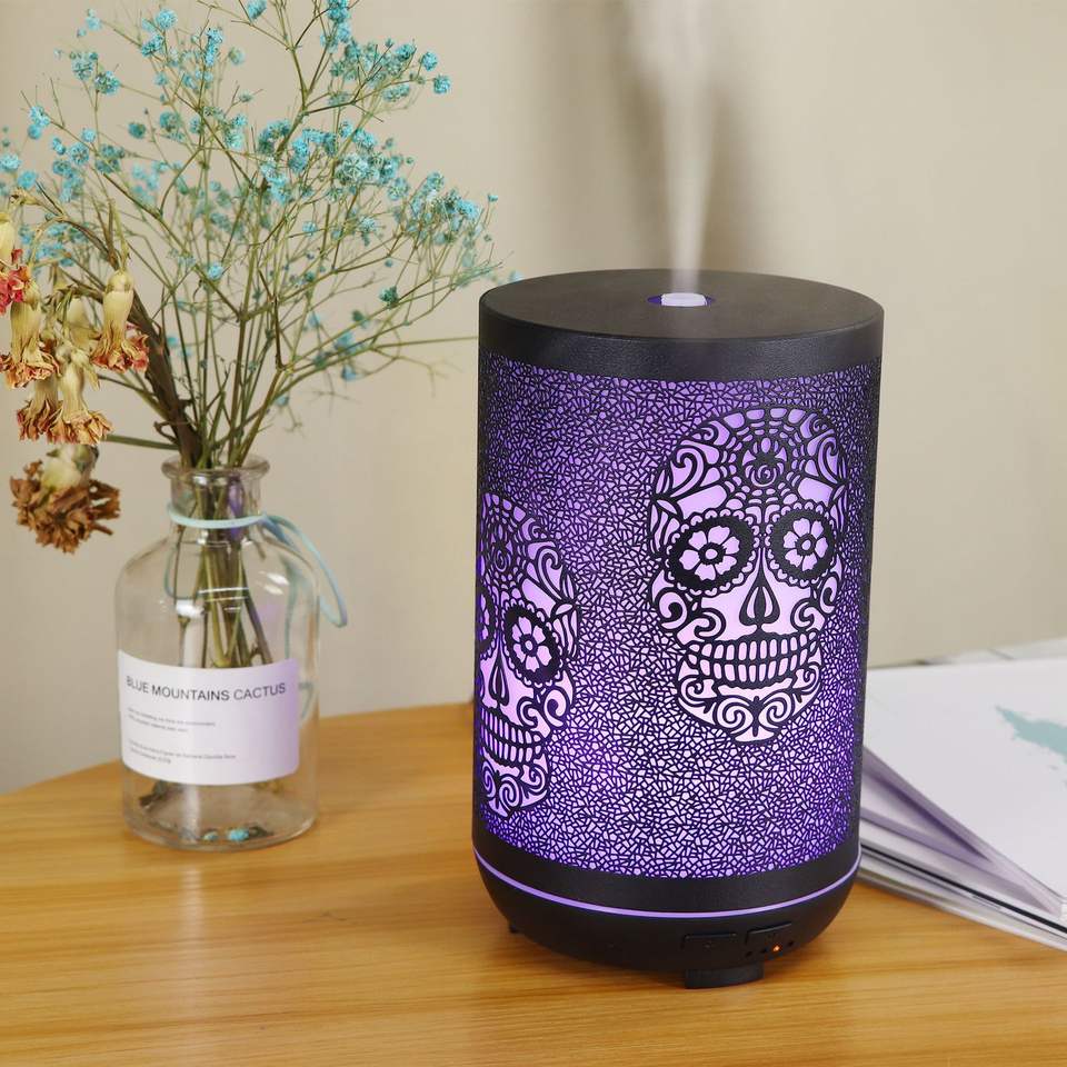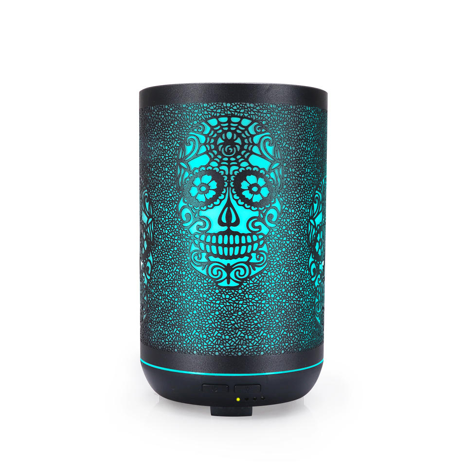 เครื่องกระจายกลิ่นหอมเหล็ก 300 มล. ดีไซน์รูปหัวกะโหลก เครื่องเพิ่มความชื้นในอากาศพร้อมไฟ LED สำหรับใช้ในบ้านและสำนักงาน