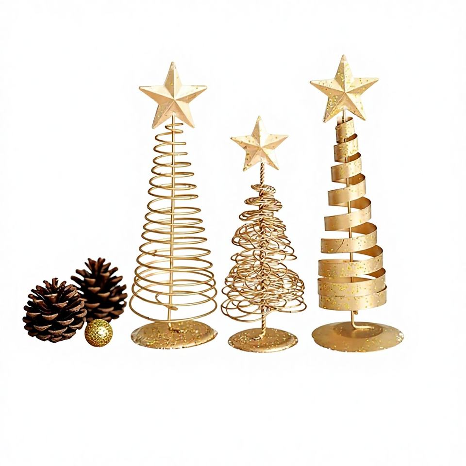 ต้นคริสต์มาสเหล็ก ชุด 3 ชิ้น ต้นสนตั้งโต๊ะเคลือบทองสำหรับตกแต่ง