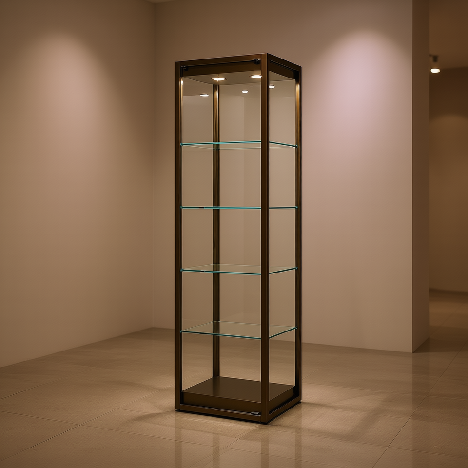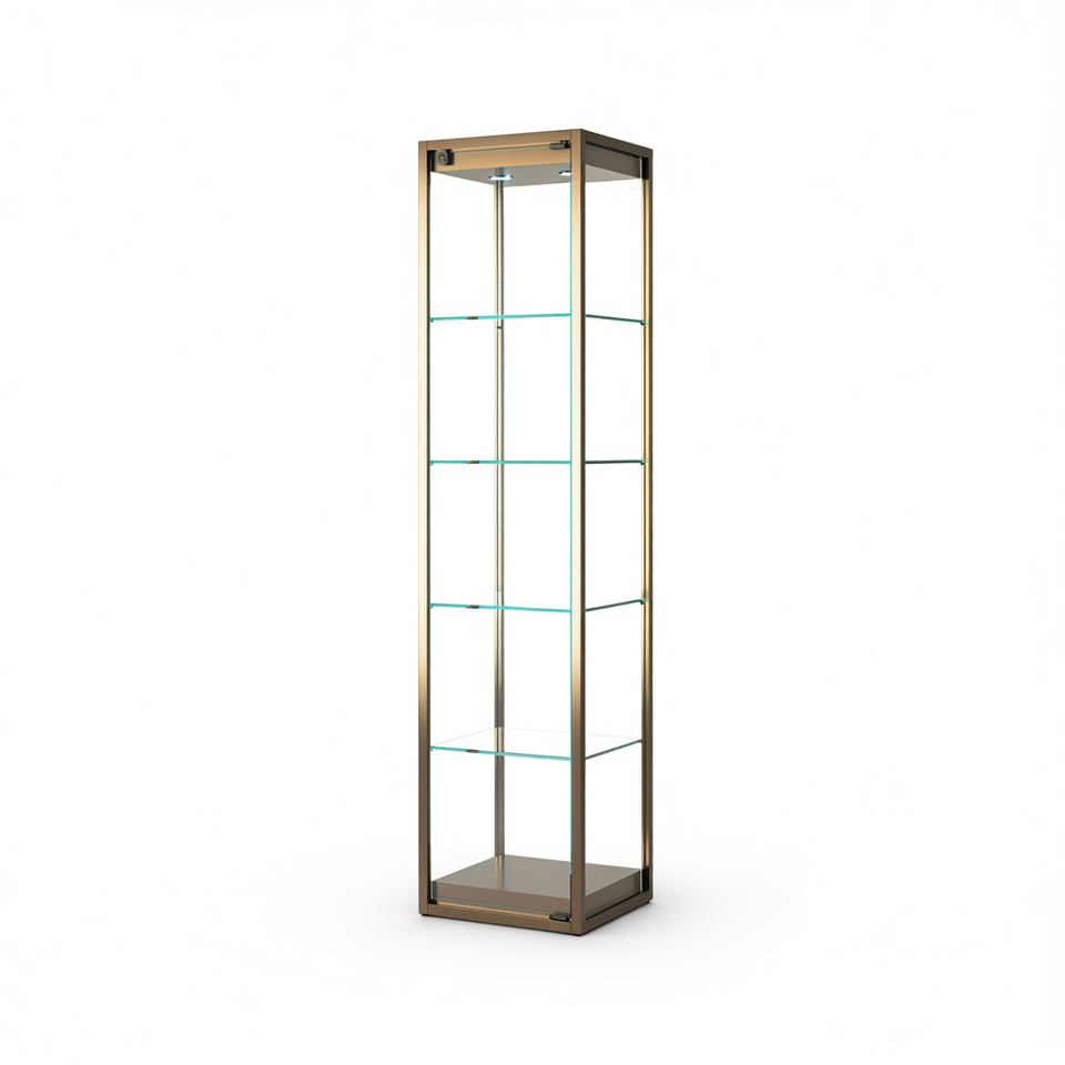 ตู้โชว์เหล็ก 45x45x190 ซม. โครงสีบรอนซ์ ประตูกระจก พร้อมไฟ LED สำหรับวางโชว์บนโต๊ะ