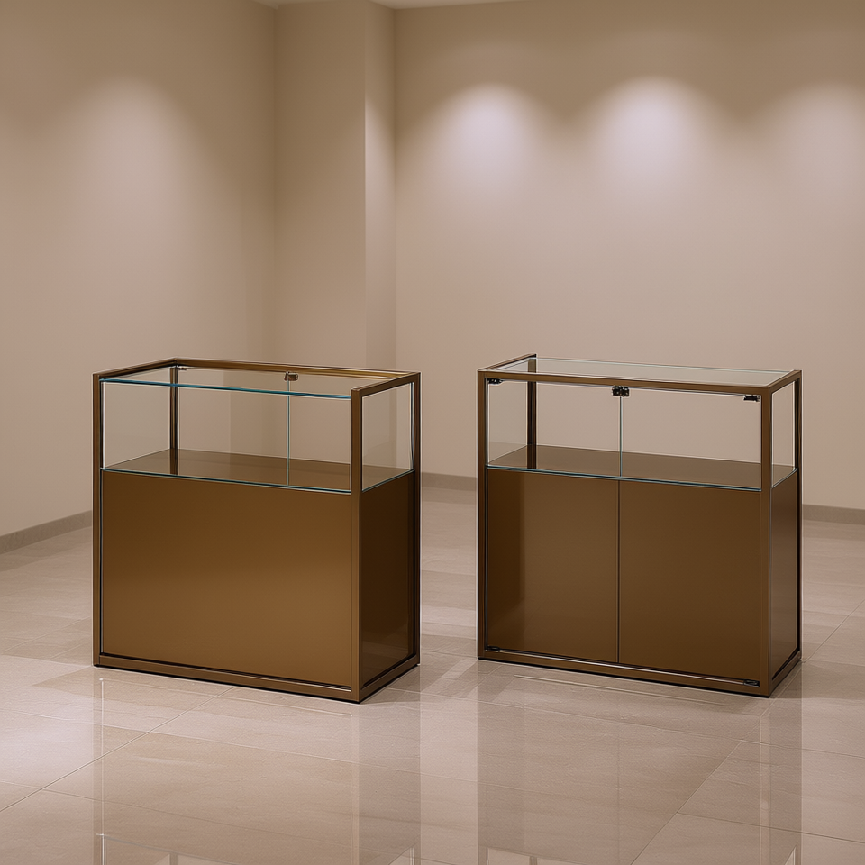 ตู้โชว์เหล็ก 95x45x95 ซม. สีบรอนซ์เคลือบเงา พร้อมกระจกด้านล่าง สำหรับวางสินค้าบนเคาน์เตอร์ขายของ
