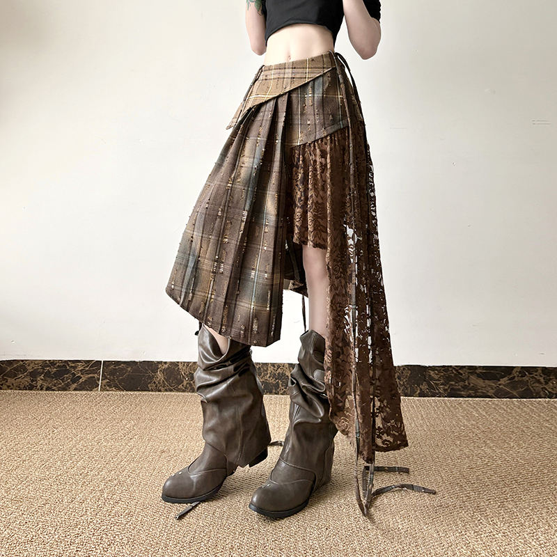 กระโปรงลายตารางแต่งผ้าลูกไม้แบบไม่สมมาตร แต่งสีตัดกัน ทรงเวสเทิร์นสไตล์เรโทร พร้อมดีเทลผูกโบว์ ความยาวปานกลาง