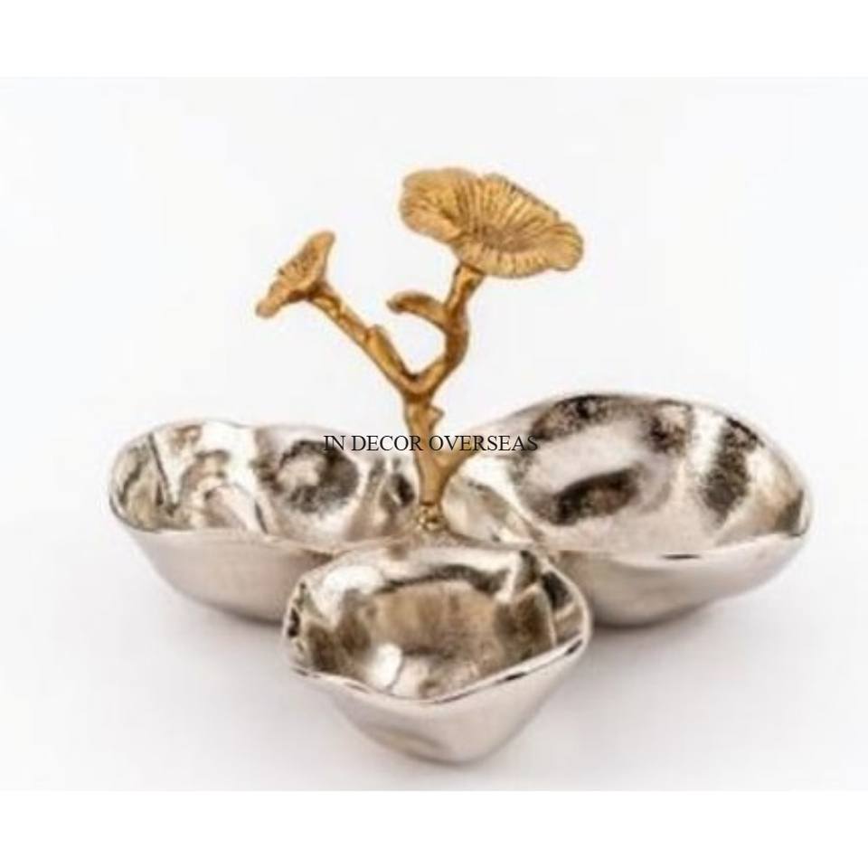 ชามแฟนซีสำหรับเสิร์ฟผลไม้แห้งและช็อคโกแลตทำจากโลหะสำเร็จรูป3ช่องสีเงินรูปทรงแปลกๆ