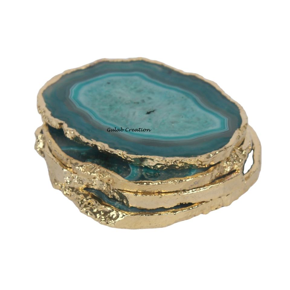 ชุดแก้วคริสตัลอาเกตสีเขียวรูปทรงไม่สม่ำเสมอพร้อมขอบทองจานรองแก้วหินธรรมชาติสำหรับตกแต่งบ้านและโต๊ะอย่างหรูหรา