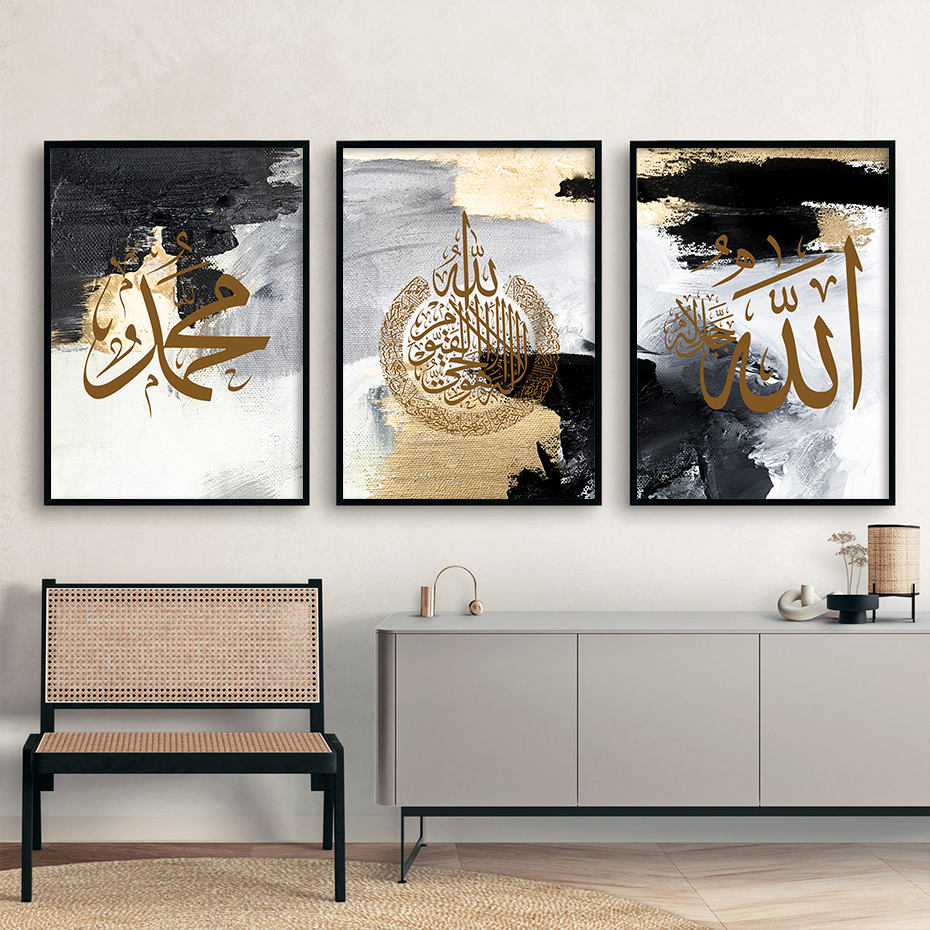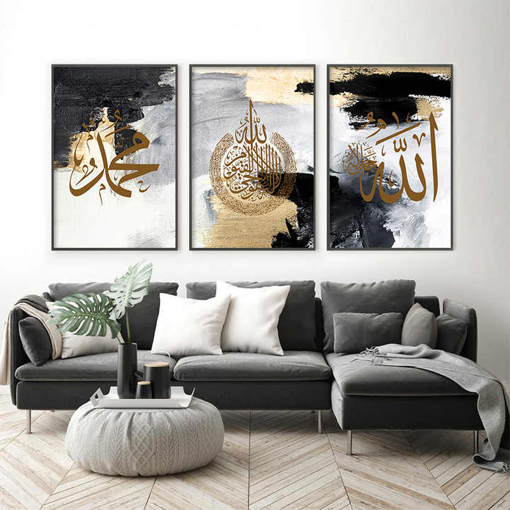ตัวอักษรอิสลาม Ayat Al-Kursi สีดำเทาทองโปสเตอร์กลอนศิลปะบนผนังภาพพิมพ์ผ้าใบตกแต่งผนังบ้าน