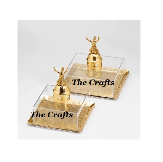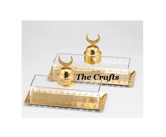 ถาดเสิร์ฟอะคริลิกและโลหะดีไซน์แบบอิสลามพร้อมที่จับรูปดวงจันทร์ถาดช็อคโกแลตพิเศษสำหรับรอมฎอน