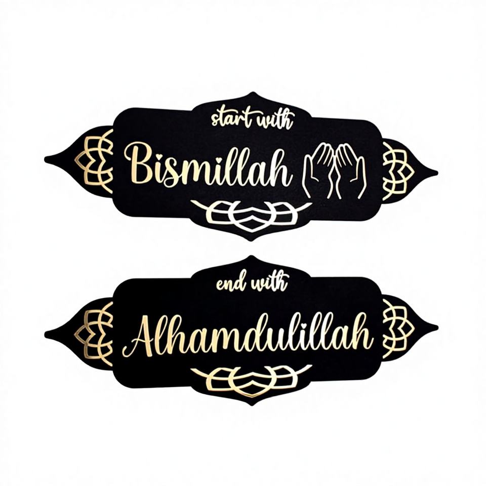 งานศิลปะติดผนังไม้สไตล์อิสลามสมัยใหม่ คำว่าบิสมิลลาห์ด้านหน้า คำว่าอัลฮัมดูลิลลาห์ด้านหลัง ตกแต่งบ้านสไตล์ฟาร์มเฮาส์แบบอาหรับ ของตกแต่งห้องครัวมุสลิม ราคาประหยัด