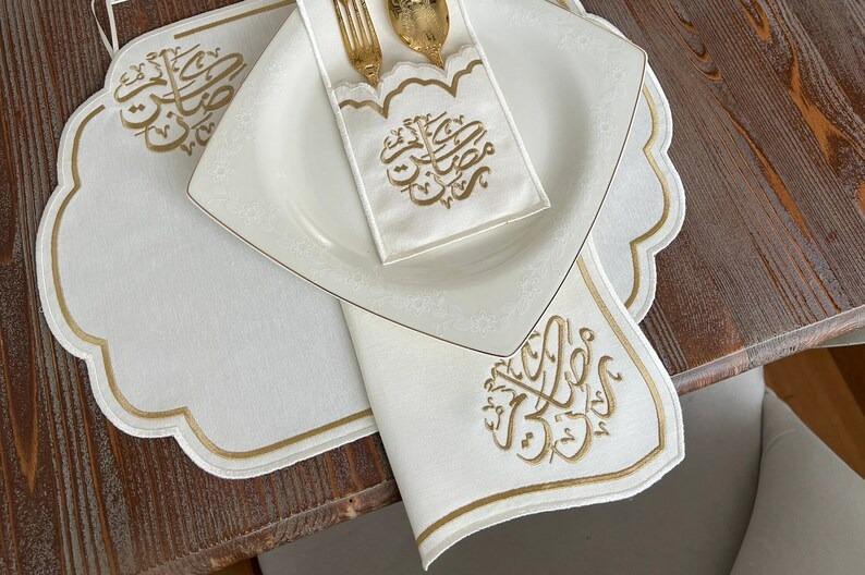 ผ้าเช็ดปากผ้าลินินลายอิสลามรอมฎอนปักโลโก้สีทองกันน้ำกำหนดเองได้