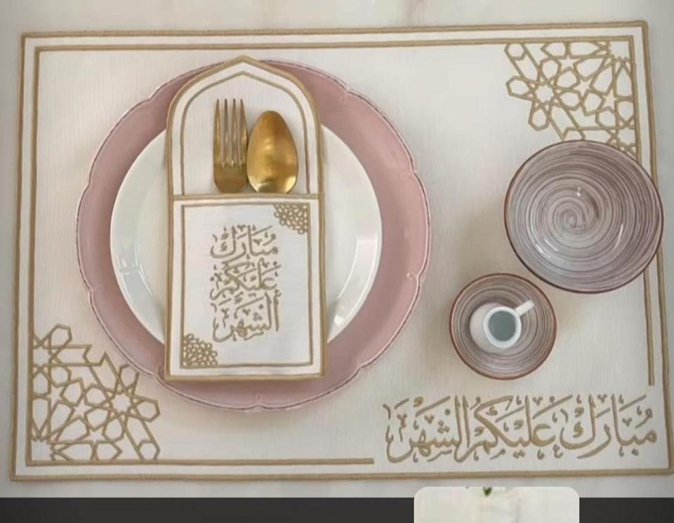 ชุดผ้ารองจานปักลายกันน้ำสำหรับเดือนรอมฎอน ลายปักสีทอง ผลิตจากผ้าฝ้ายรักษ์โลก พร้อมช่องใส่ผ้าเช็ดปากและอุปกรณ์เสริม