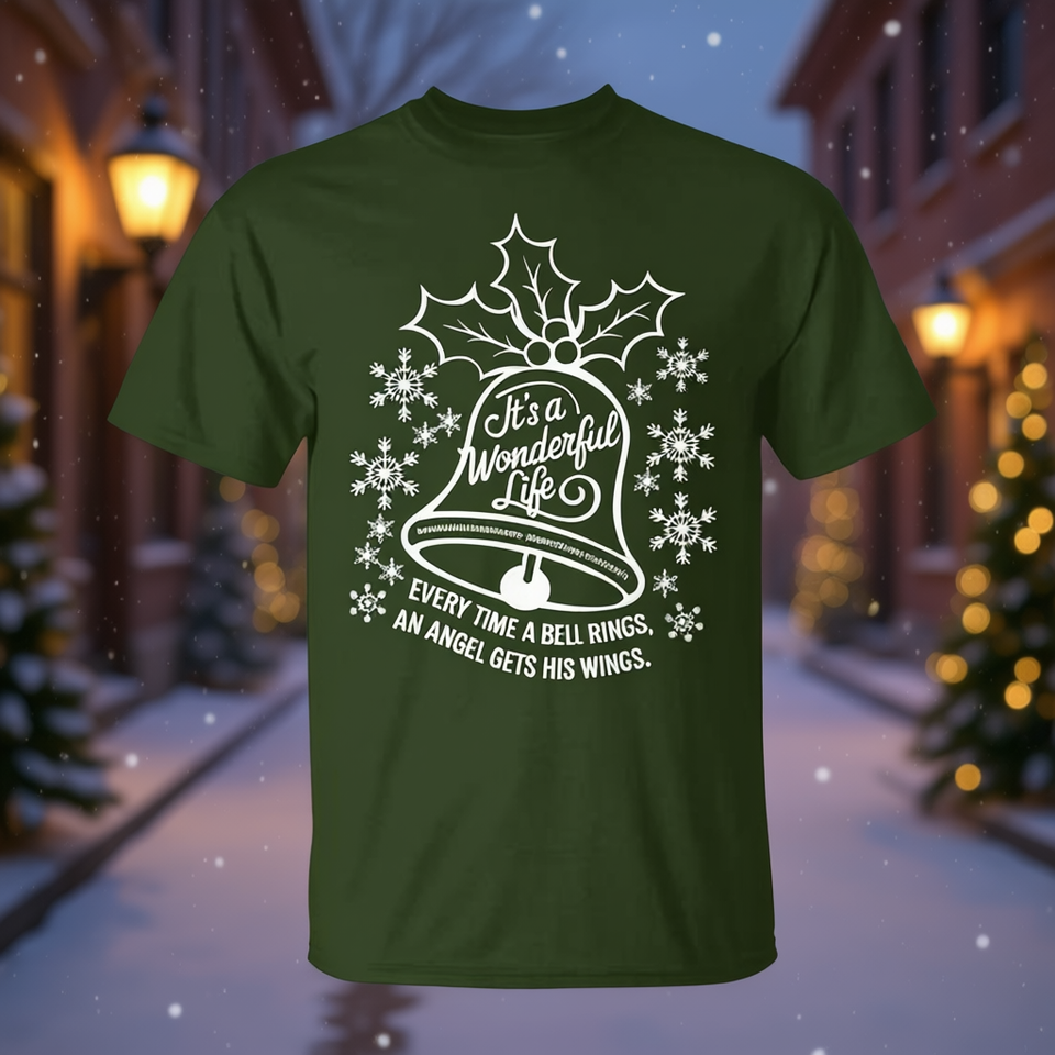 เสื้อยืดภาพยนตร์คริสต์มาส "อีท์ อีส อะ วันเดอร์ฟูล ไลฟ์" พร้อมดีไซน์รูประฆังและข้อความ