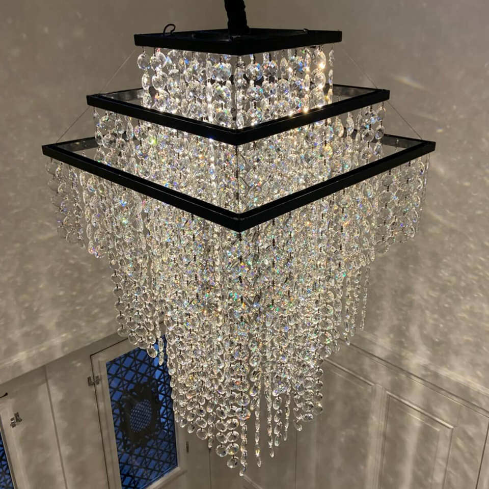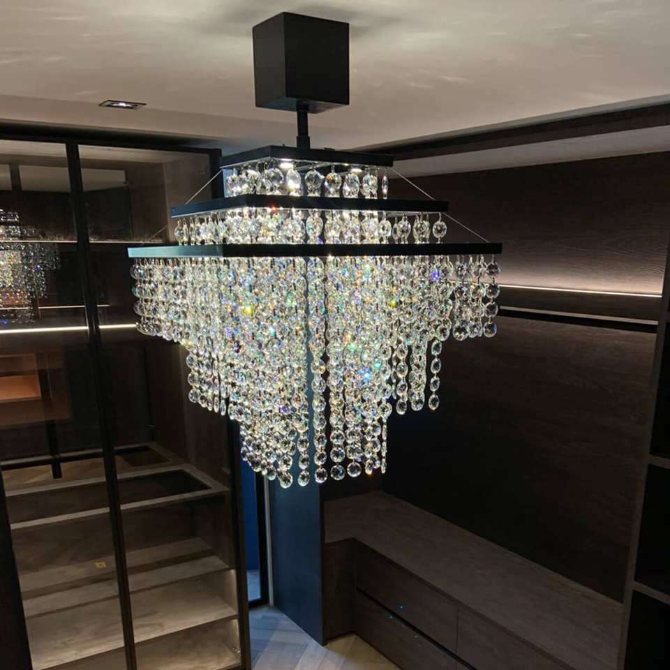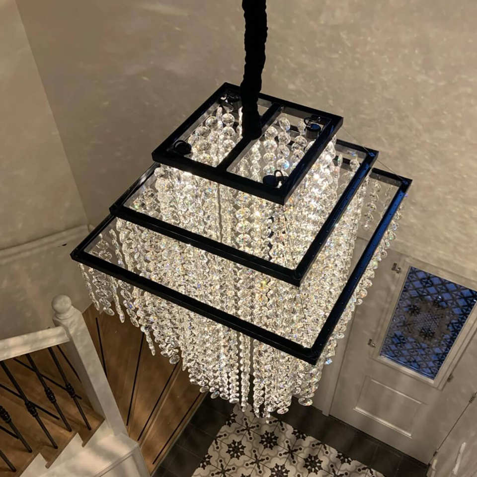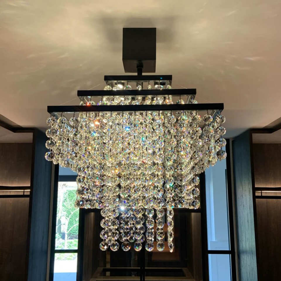 โคมระย้าคริสตัล K9หรูหราพร้อมกรอบเหล็กสีดำดีไซน์แบบอิตาลีโถงทางเดินห้องอาหารทันสมัย