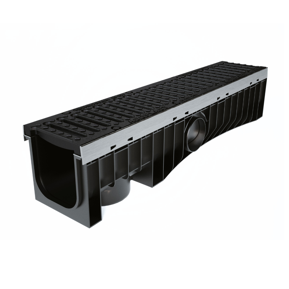 รางระบายน้ำ HDPE รุ่น EXEL 150 ของอิตาลี ขนาด D400 ร่อง 18 มม. พร้อมตะแกรงเหล็กดัดแบบดัดขึ้นรูป ได้รับการรับรองมาตรฐาน CE สีดำ ดีไซน์ทันสมัย สำหรับงานก่อสร้างภายนอกอาคาร