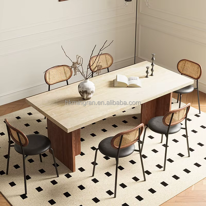 โต๊ะอาหารทรงสี่เหลี่ยมผืนผ้าสไตล์อิตาเลียนหรูหราทันสมัยเรียบง่ายทำจากไม้เนื้อแข็งคุณภาพสูง พร้อมชุดเก้าอี้โครงโลหะแบบปรับเปลี่ยนได้