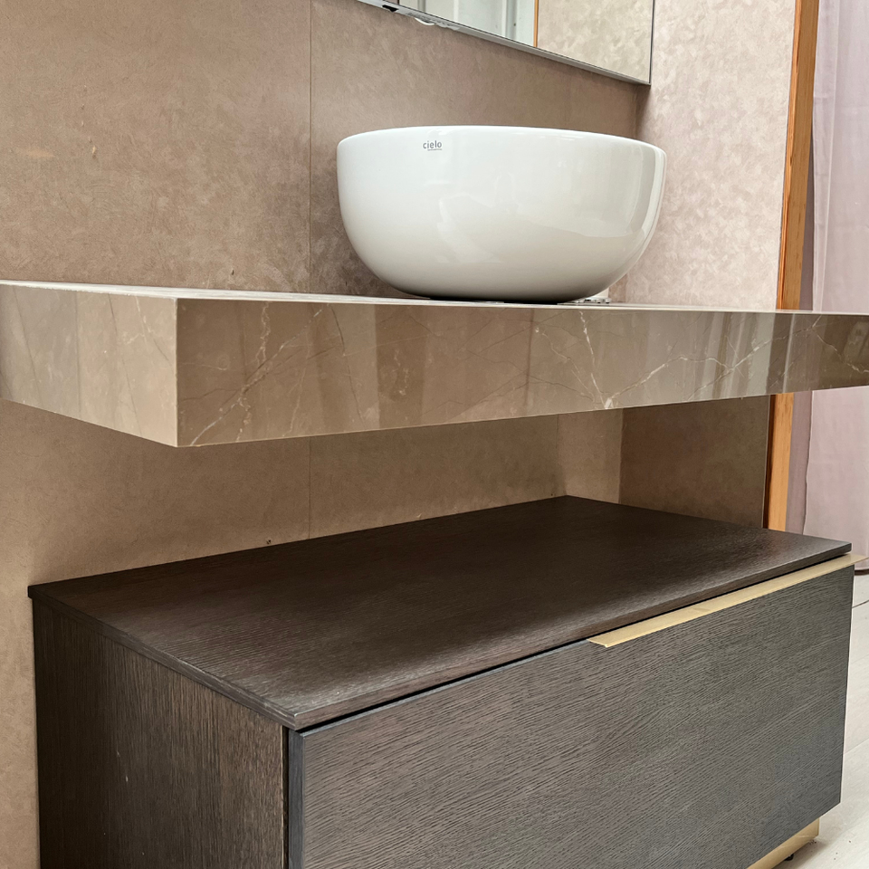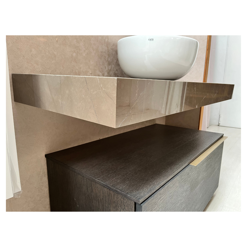 ชั้นวางของพอร์ซเลนลายหินอ่อนสีเบจ งานแฮนด์เมด ดีไซน์หรูหรา ผลิตในอิตาลี ขนาด 120x50x10 ซม. ผิวเงา ลายเส้นอ่อนๆ ต่อแบบมิเตอร์จอยท์ เหมาะสำหรับห้องน้ำ
