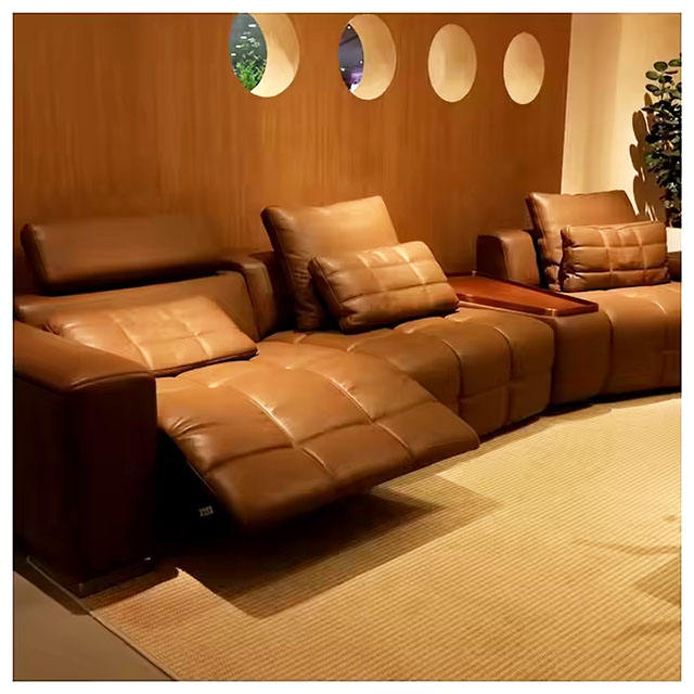 โซฟาหนังสีน้ำตาลปรับไฟฟ้า3ที่นั่งเฟอร์นิเจอร์อิตาลีที่ทันสมัยหรูหราห้องนั่งเล่นหนังสีน้ำตาล