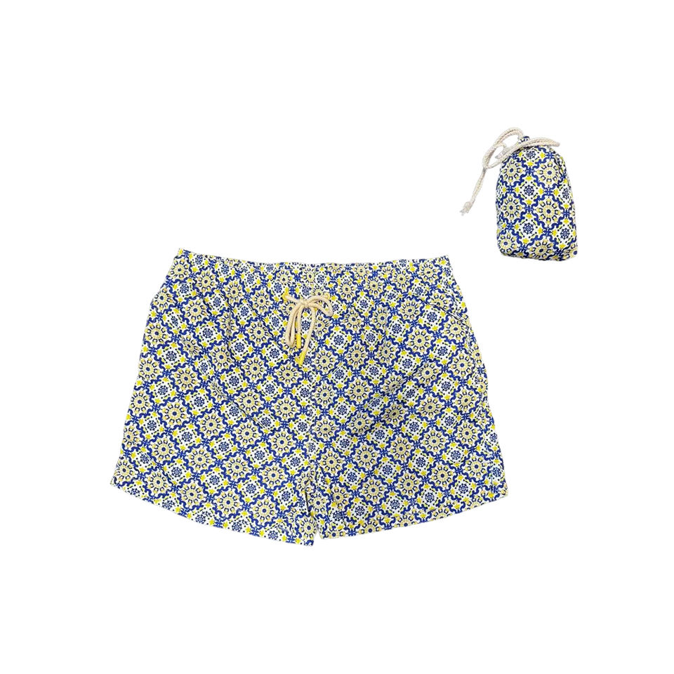 กางเกงว่ายน้ำขาสั้นพิมพ์ลายชายหาดของผู้ชายเอวยางยืดแห้งเร็วมีกระเป๋าผ้าใส่สบาย