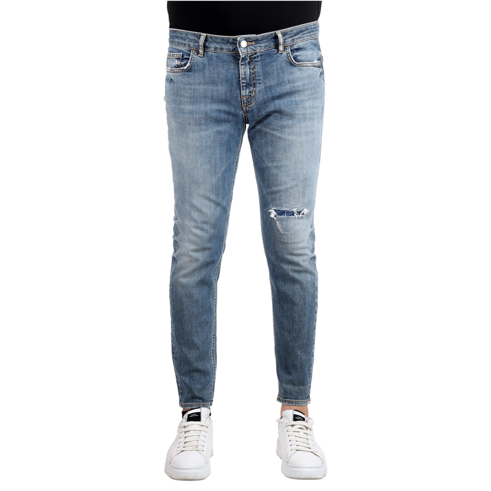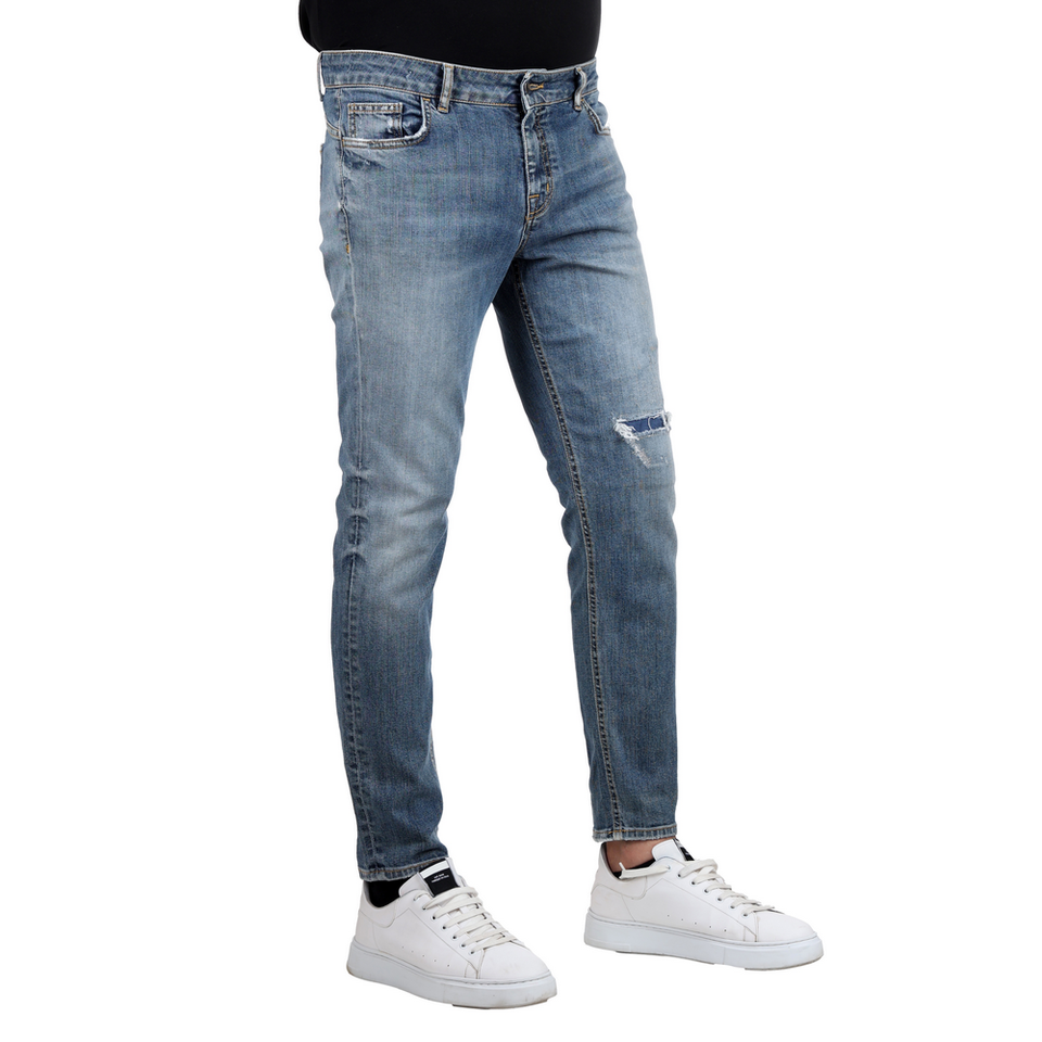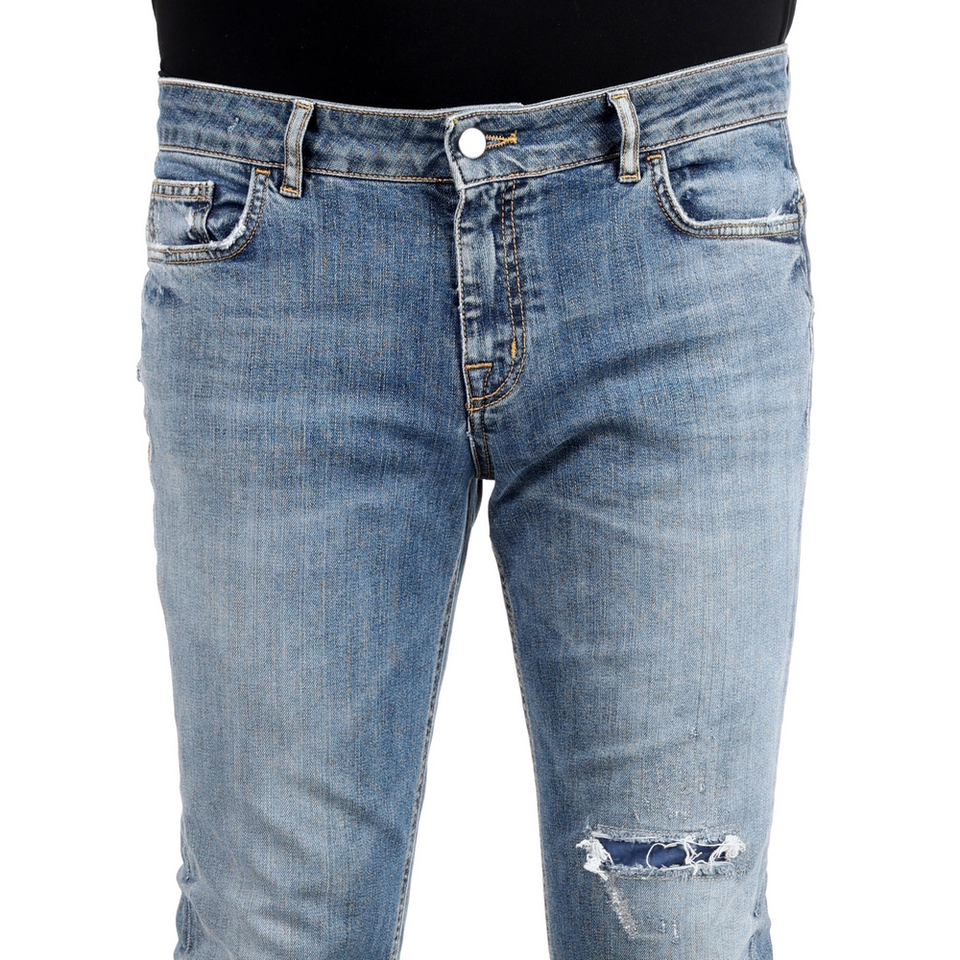 กางเกงยีนส์สีน้ำเงินทรงสกินนี่ฟิตแบบฉีกขาดที่ขา สไตล์แบรนด์ส่วนตัว ตัดเย็บแบบอิตาลี คอลเลคชั่นใหม่ สำหรับขายส่ง ผ้า 98% คอตตอน 2% อะรามิด