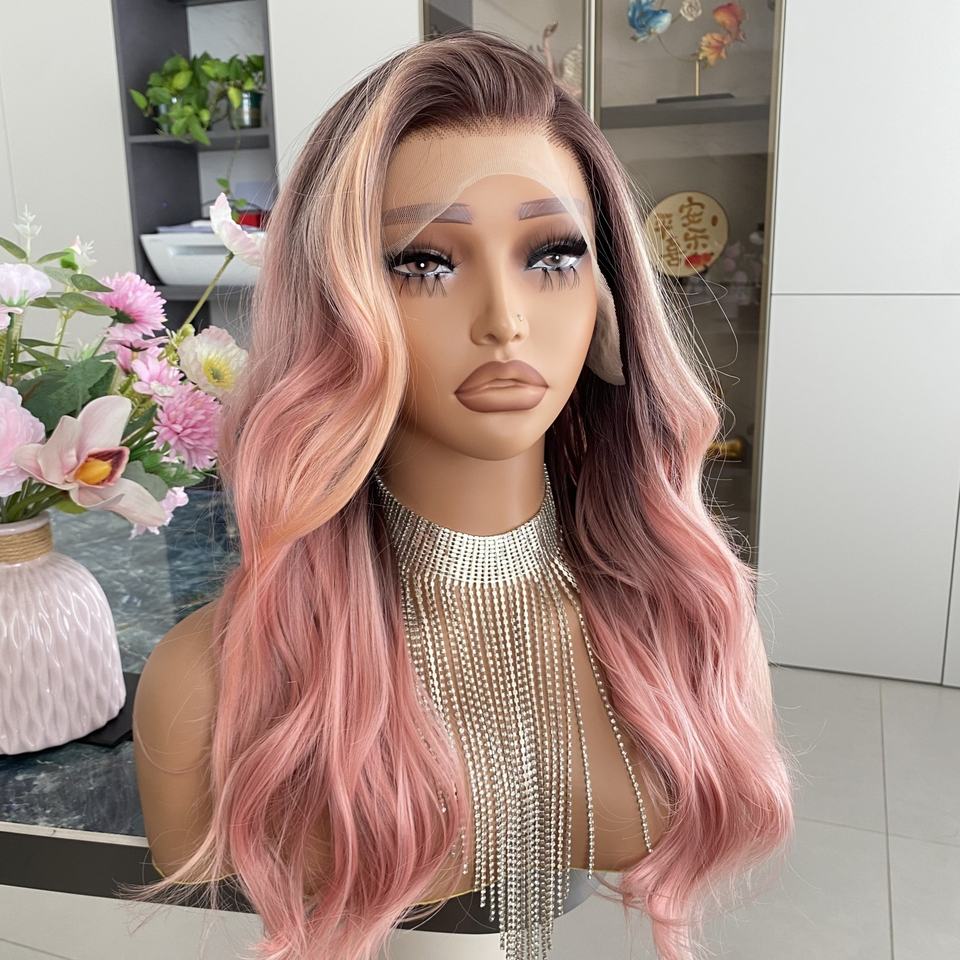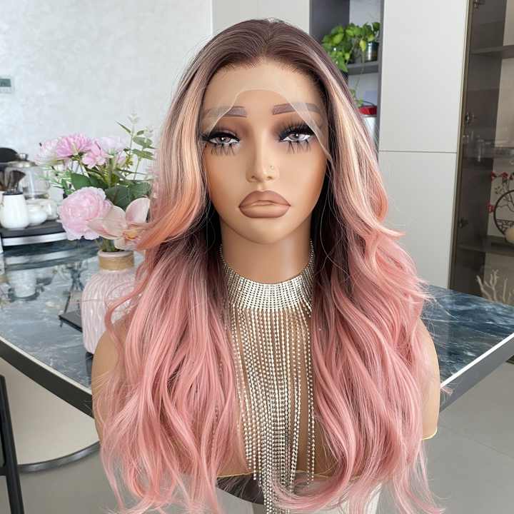 วิกผมสังเคราะห์แบบลูกไม้ 13x4 สีชมพูพีชสไตล์อิตาเลียน แบบใส ไม่ต้องใช้กาว ดูเป็นธรรมชาติ พร้อมไรผมที่ถูกรูปทรงไว้แล้ว ทนความร้อน