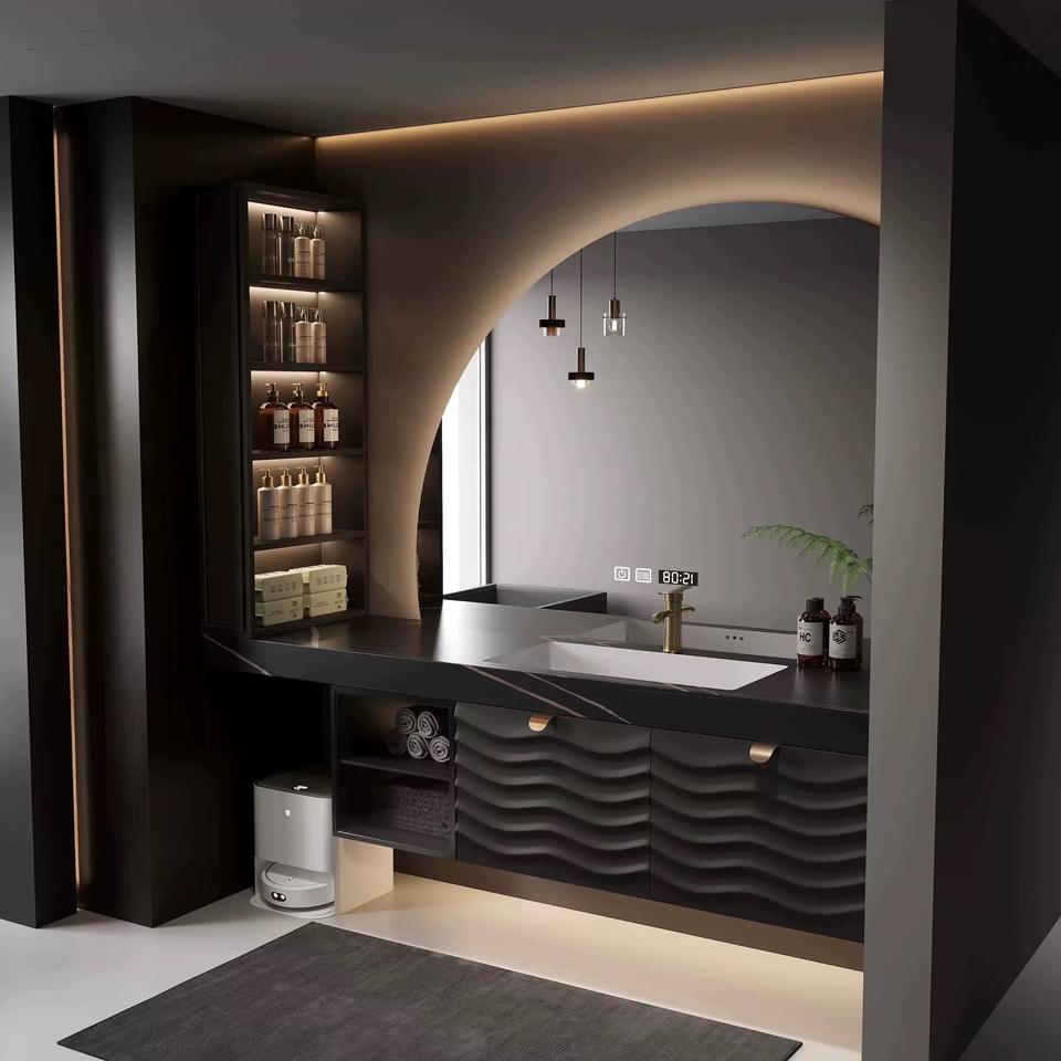 ตู้ห้องน้ำอิตาเลียนสไตล์มินิมอลทรงสี่เหลี่ยมผืนผ้า ทำจากไม้เอ็มดีเอฟเคลือบเงา พร้อมกระจกดิจิตอลอัจฉริยะ จุของได้เยอะ เหมาะสำหรับโรงพยาบาล