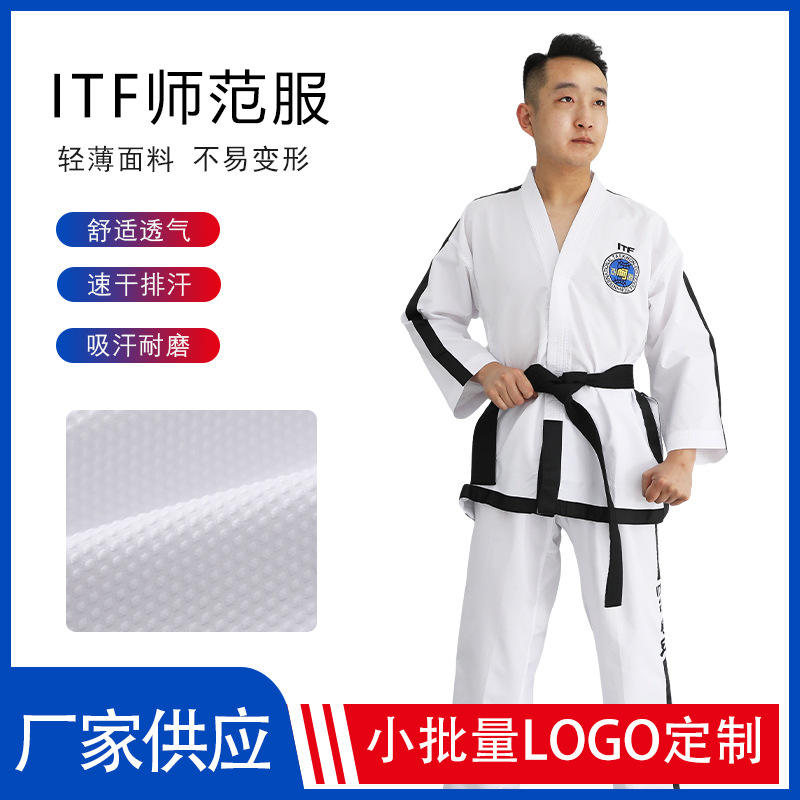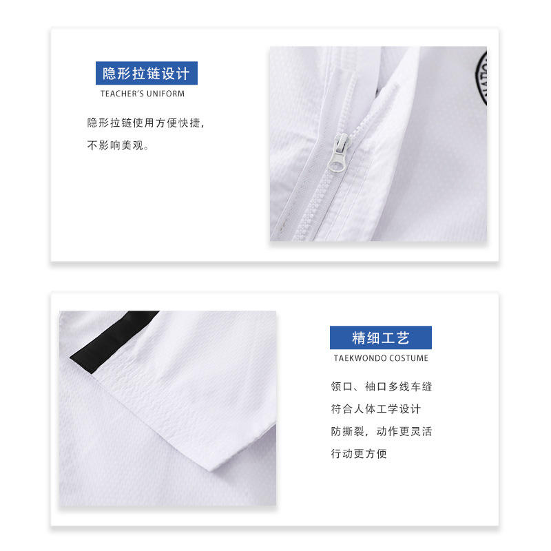 ชุดยูนิฟอร์มครูสอนเทควันโดผู้ชาย สีขาว พร้อมเข็มขัดสีดำ ชุดฝึกศิลปะการต่อสู้ที่ทนทาน สำหรับการแข่งขันและการฝึกซ้อม
