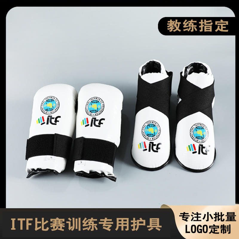 ITF ชุดถุงมือและรองเท้าซ้อมเทควันโดสำหรับเด็ก XS M L อุปกรณ์ป้องกันทนทานสำหรับทุกเพศอุปกรณ์ศิลปะการต่อสู้