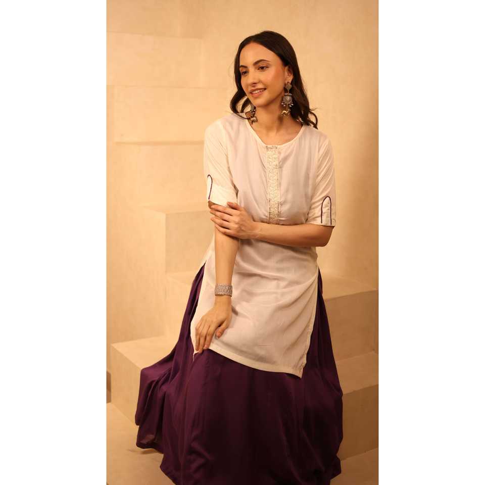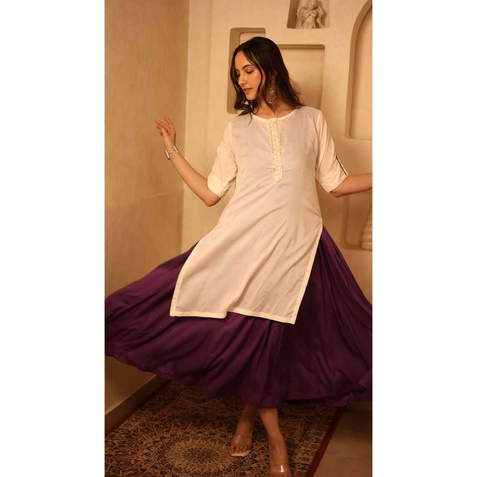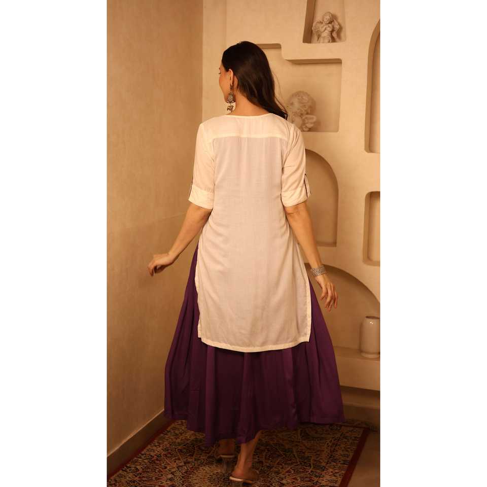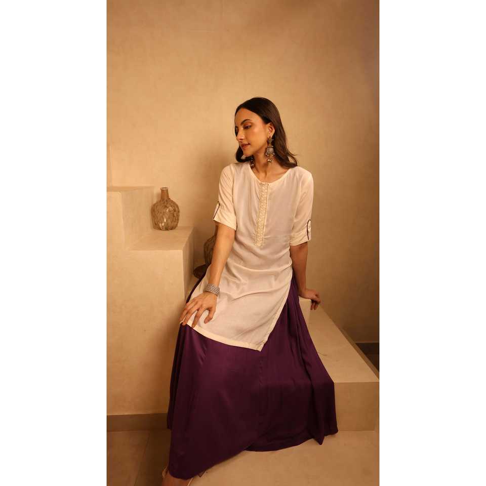 ชุดเดรสผ้าซาตินสีงาช้างและสีม่วงพร้อมชุดคุร์ตา สวมใส่สบาย ทรงเอวธรรมชาติ คอทรงโอ แขนสั้น สีตัดกัน