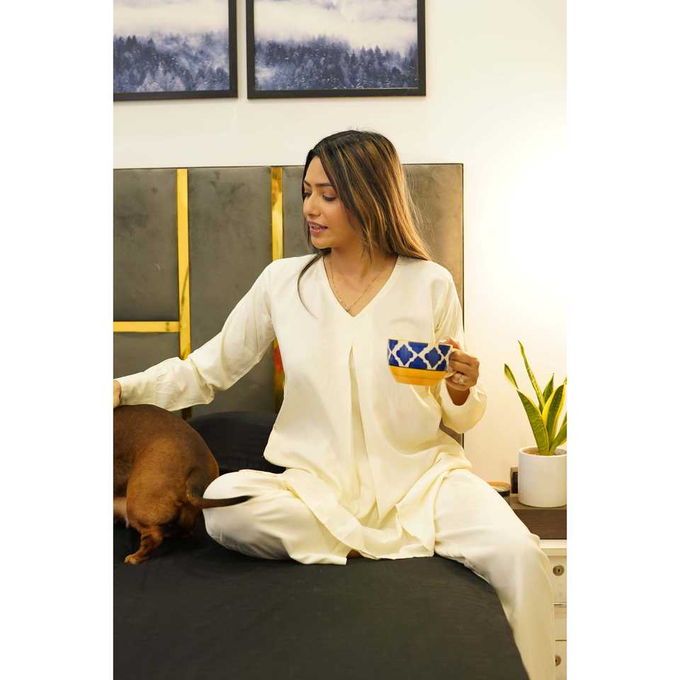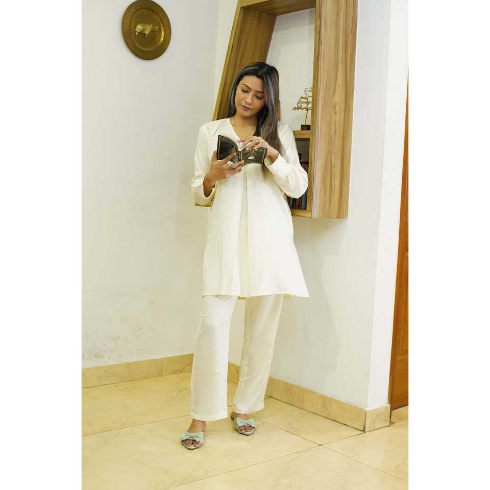 ชุดคุรตะผ้าซาตินสีขาวงาช้างแบบเซ็ต 2 ชิ้น