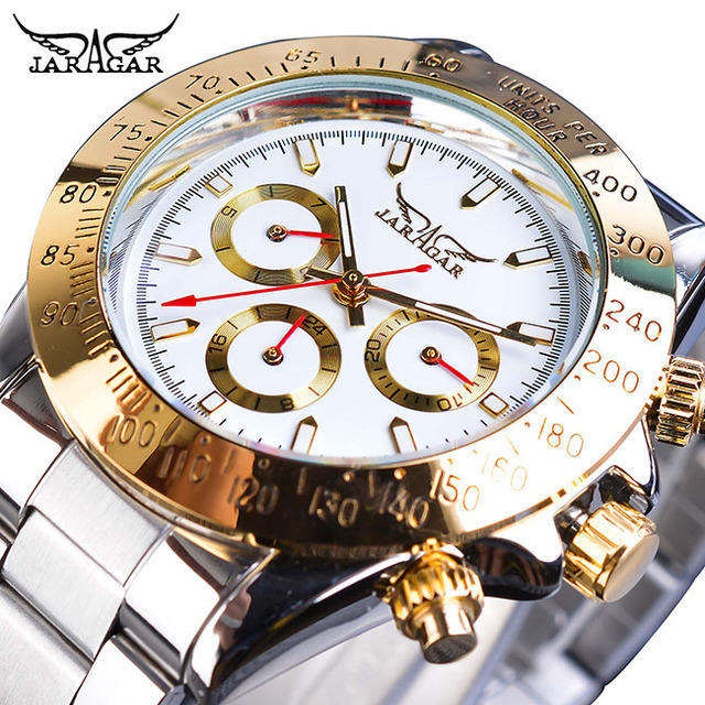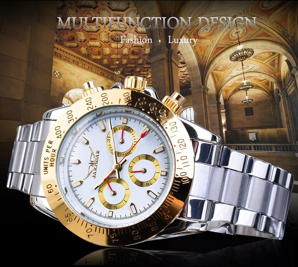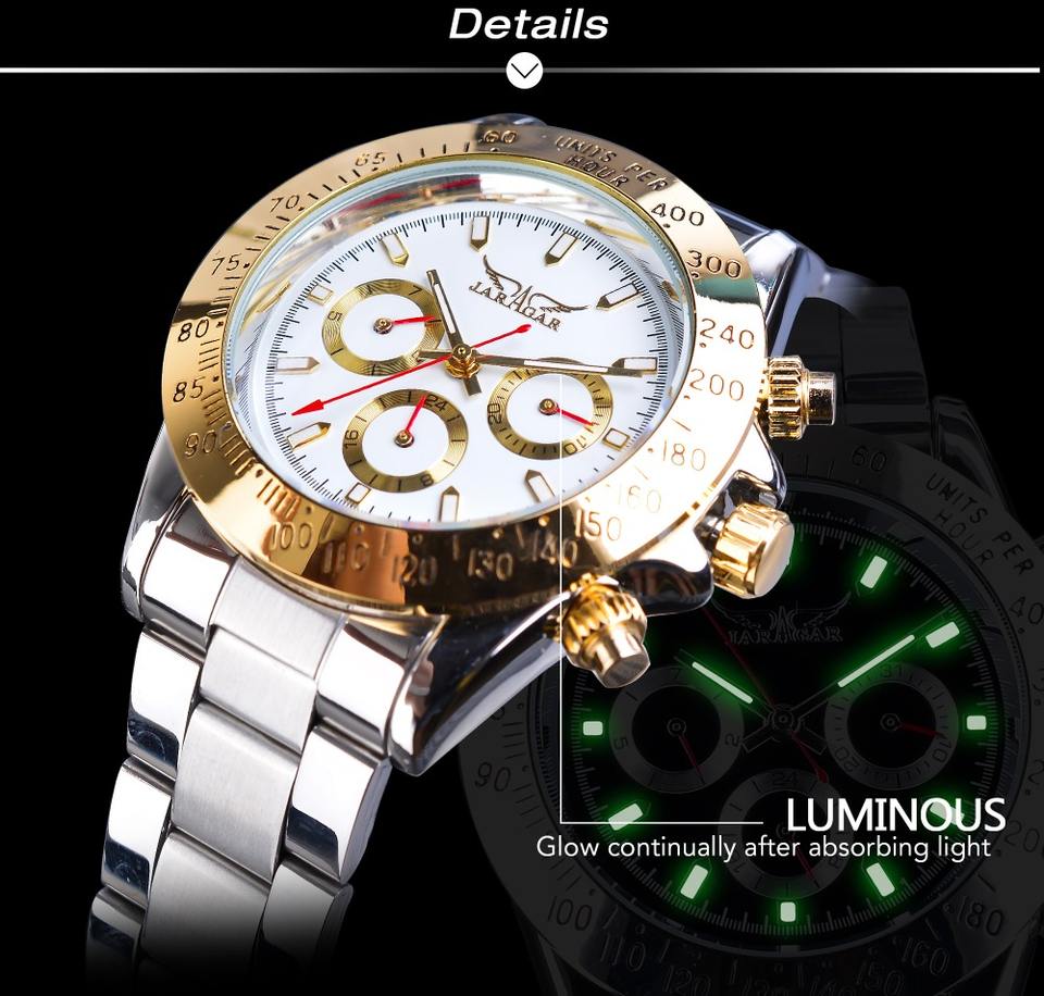 Jaragar นาฬิกากลไกอัตโนมัติสำหรับผู้ชาย, สายสแตนเลสสตีลแฟชั่นหรูหรากันน้ำเรืองแสง