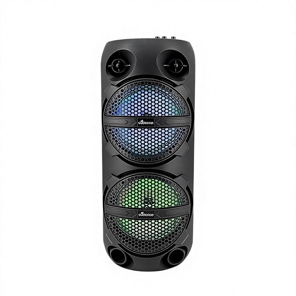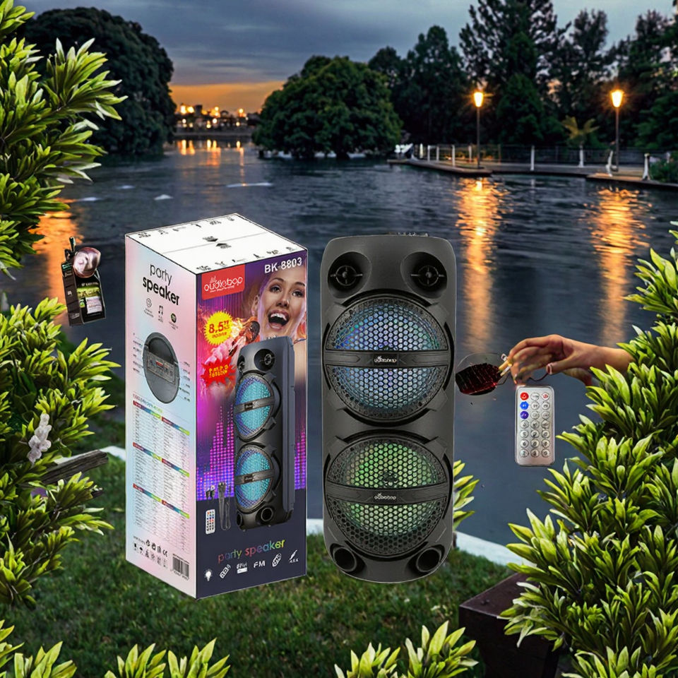ลำโพงคาราโอเกะไร้สาย JBR-8809 แบบคู่ 8 นิ้ว พร้อมช่อง AUX รองรับ 5.3 ระบบไร้สาย ไฟ RGB LED กำลังขับ 20 วัตต์ เหมาะสำหรับงานปาร์ตี้กลางแจ้ง ใช้สำหรับดีเจ แบตเตอรี่แบบชาร์จได้