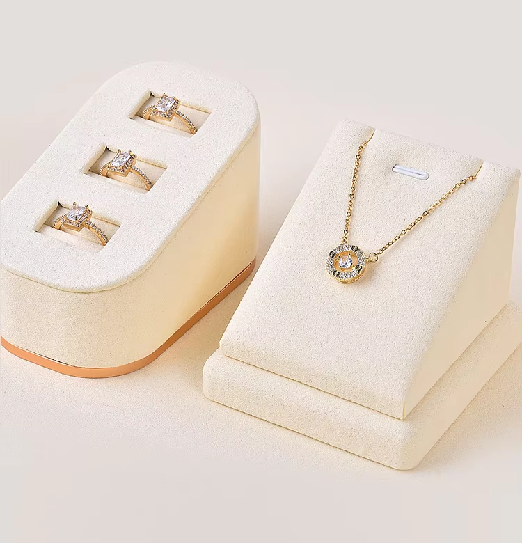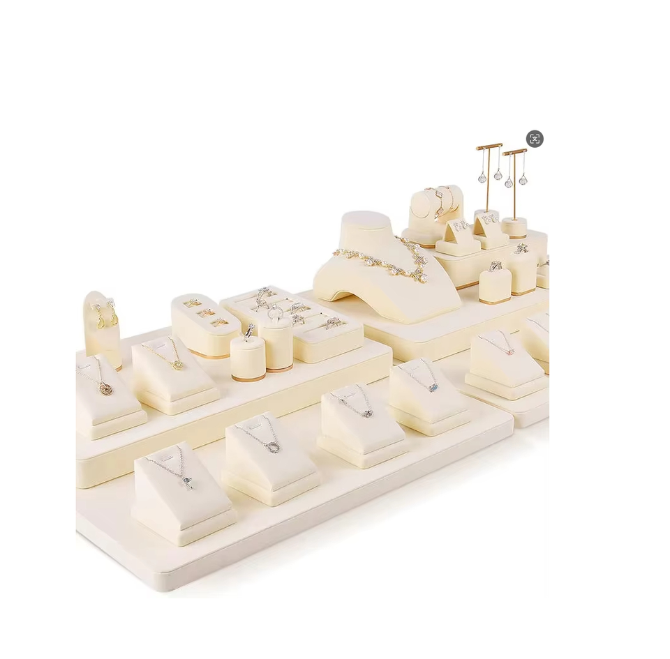 Jinsky ชุดจัดแสดงเครื่องประดับสร้อยข้อมือแหวนสร้อยคอทำจากไมโครไฟเบอร์สีเบจสำหรับร้านค้าที่หน้าต่าง