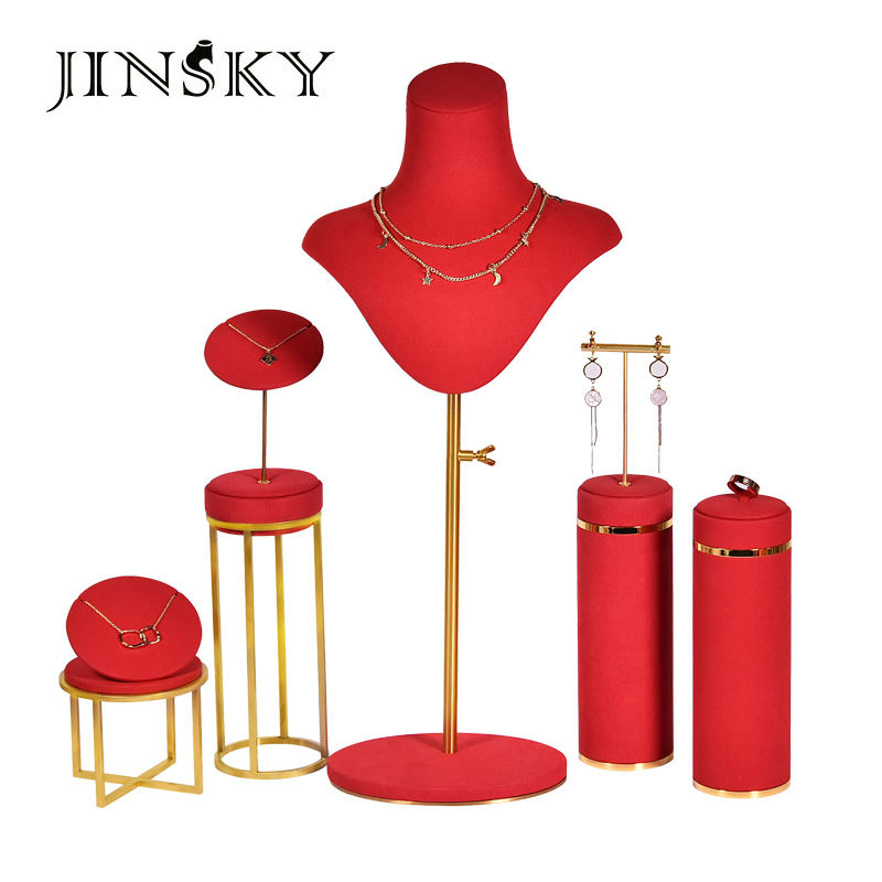 Jinsky ที่ตั้งแสดงต่างหูสร้อยคอแฟชั่นต่างหูแบบยืนแสดงไมโครไฟเบอร์สำหรับหน้าต่างตู้โชว์เครื่องประดับสีแดง