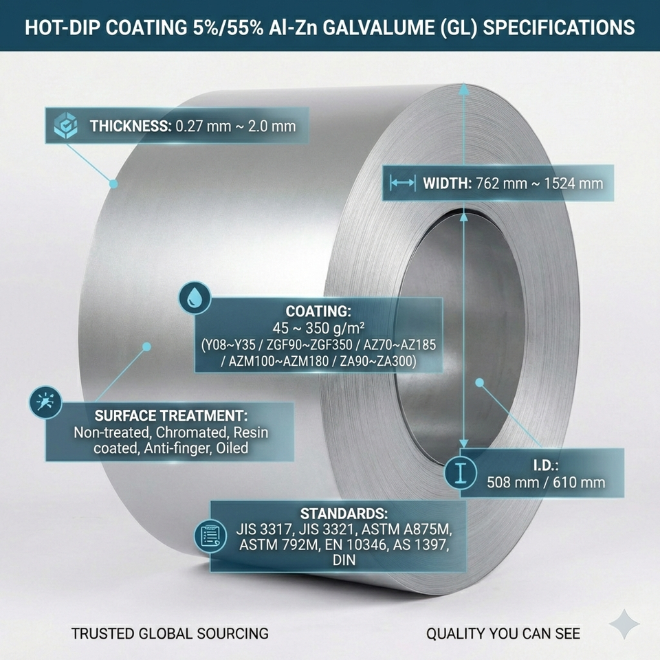 เลือกเลยข้อมูลจำเพาะ: JIS G3317,JIS G3321,ASTM A875M,ASTM A792M,EN 10346,AS 1397,DIN