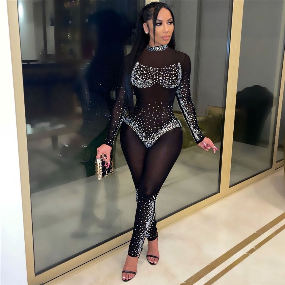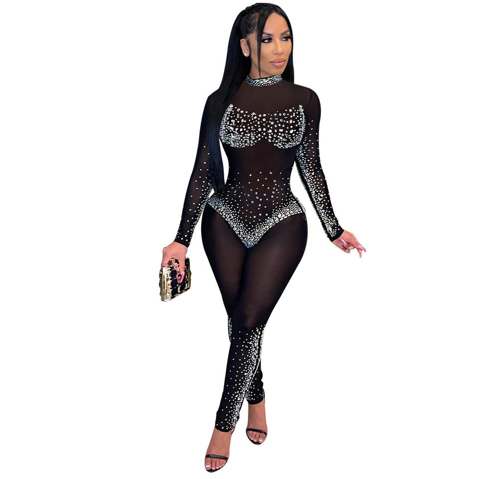 จั๊มสูทเซ็กซี่ของผู้หญิง,รอมเปอร์แขนยาวเจาะด้วย Ironed ตาข่ายมุมมองแฟชั่นปี JL033