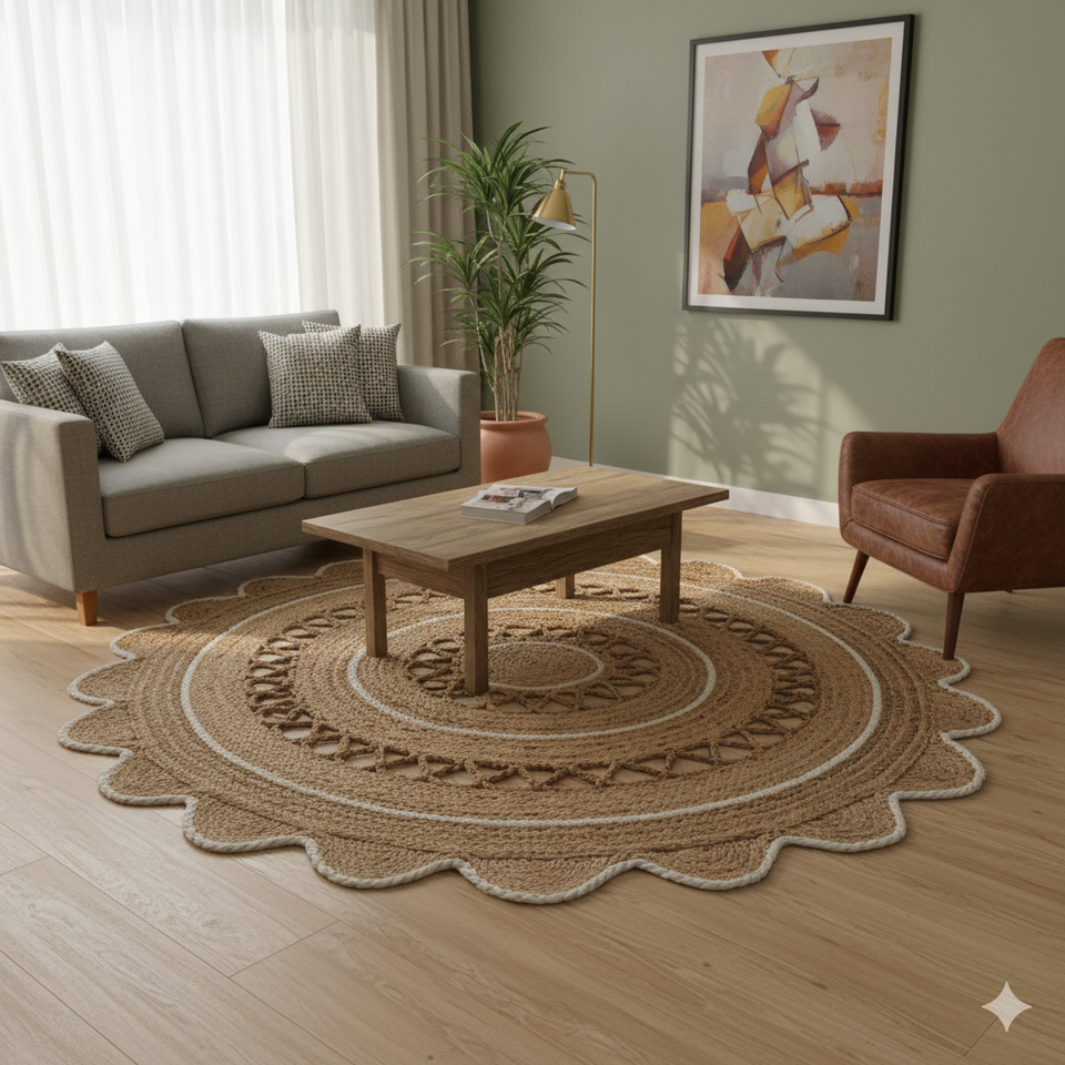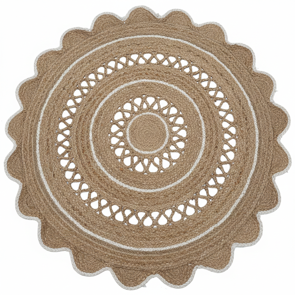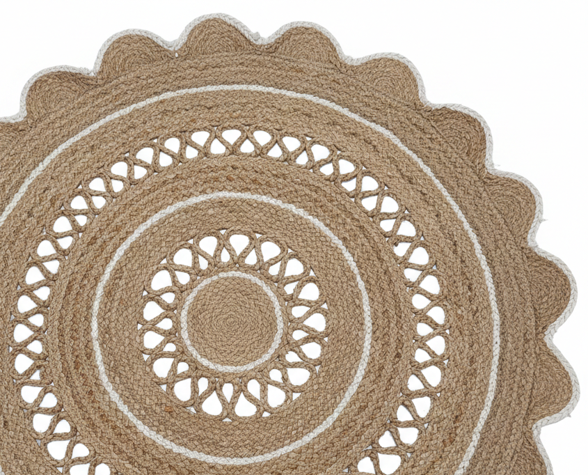 พรมถักทรงกลมลายทิกกี้ ทำจากผ้าฝ้ายผสมปอกระเจา ผลิตด้วยเครื่องจักร เป็นมิตรกับสัตว์เลี้ยง เป็นมิตรกับสิ่งแวดล้อม แบบสองชั้น สำหรับพื้นที่ขนาดใหญ่