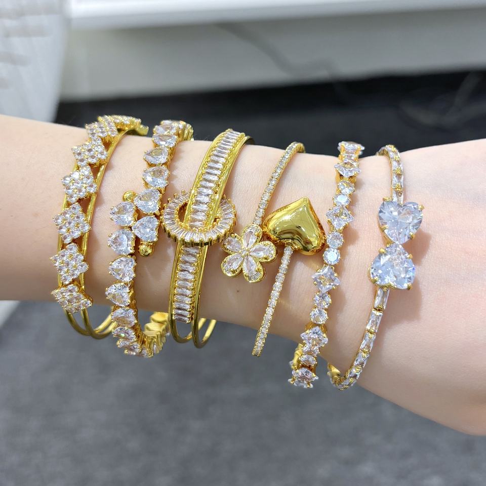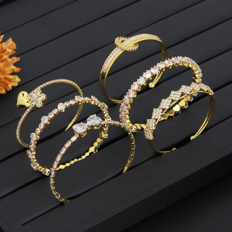 กำไลข้อมือเปิดแบบหรูหราสำหรับผู้หญิงจากโรงงาน JXX ทำจากทองเหลืองชุบทอง 24K ประดับเพชรคิวบิกเซอร์โคเนีย ขายส่งกำไลแฟชั่น