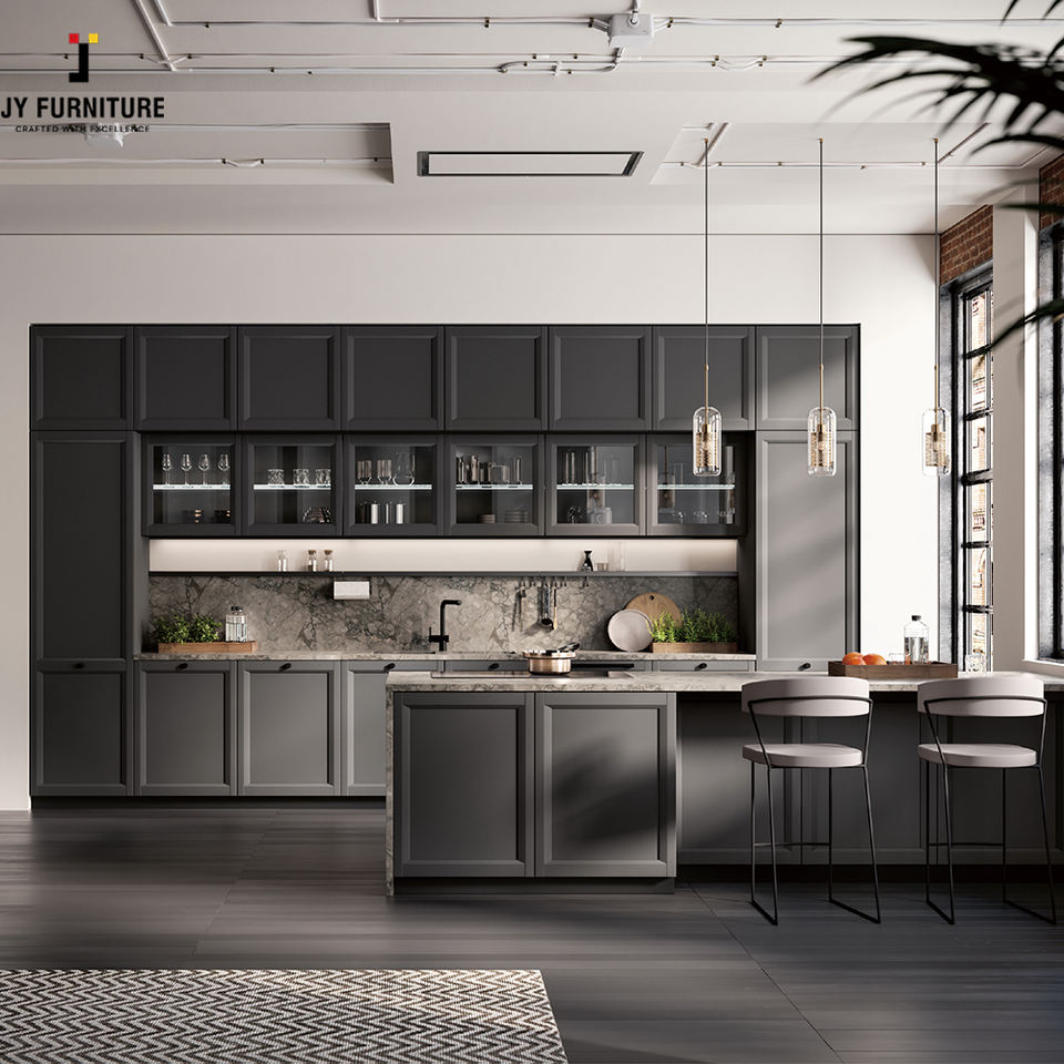 โครงการ JY ผลิตตู้ครัวแบบโมดูลาร์สไตล์ยุโรปสมัยใหม่จากโรงงานเวียดนาม บานพับคุณภาพสูง เฟอร์นิเจอร์ไม้ไม้อัดหรูหรา ขายส่ง
